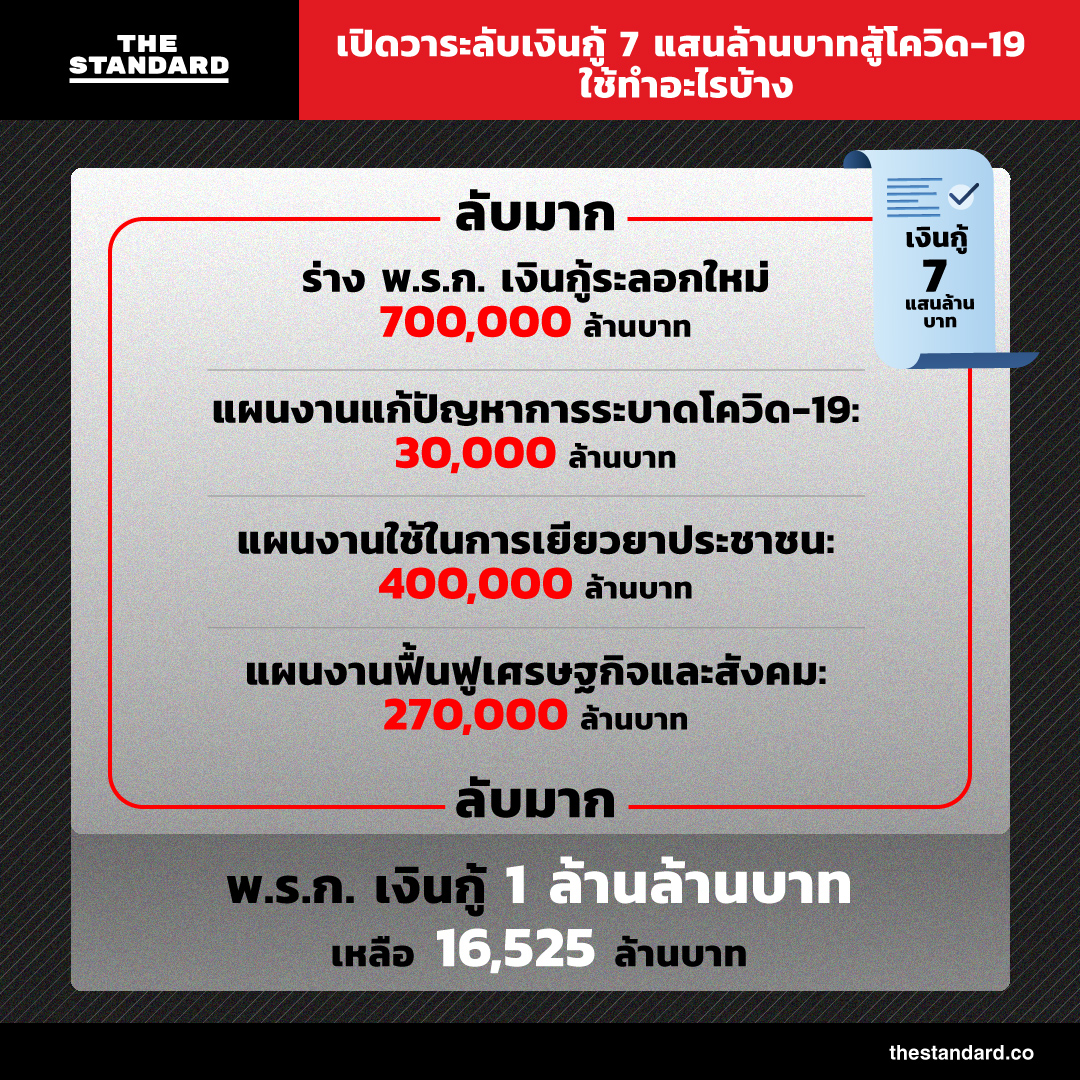 สำหรับ พ.ร.ก. เงินกู้ระลอกใหม่นี้ มีแผนนำไปใช้ในด้านสาธารณสุข 3 หมื่นล้านบาท ใช้ในการเยียวยาประชาชน 4 แสนล้านบาท และใช้สำหรับแผนงานฟื้นฟูเศรษฐกิจและสังคมอีก 2.7 แสนล้านบาท