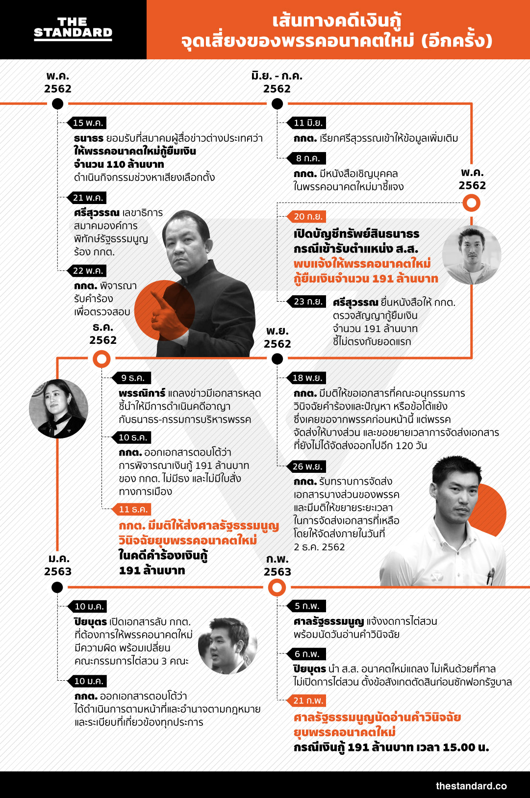 THE STANDARD รวบรวมช่วงเวลาสำคัญของเส้นทางคดีเงินกู้พรรคอนาคตใหม่ ที่อาจกลายเป็นจุดเสี่ยง และเป็นจุดเปลี่ยนสำคัญของการเมืองไทยไปพร้อมกัน ในวันพิพากษา 21 กุมภาพันธ์ 2563 ที่จะถึงนี้