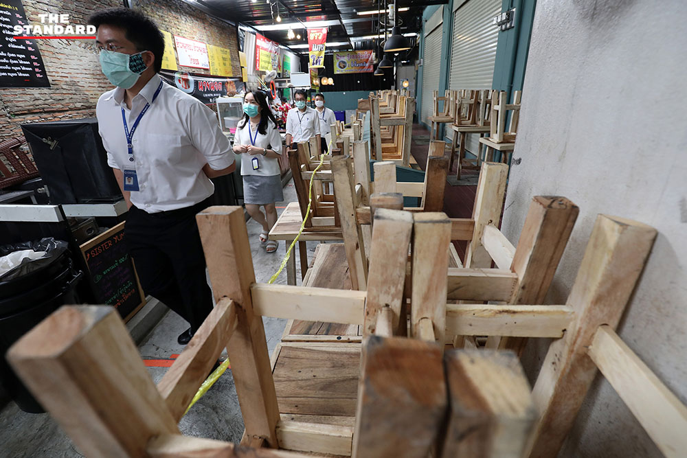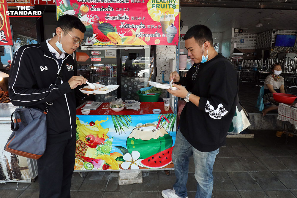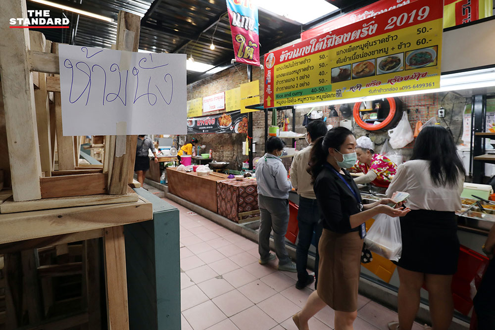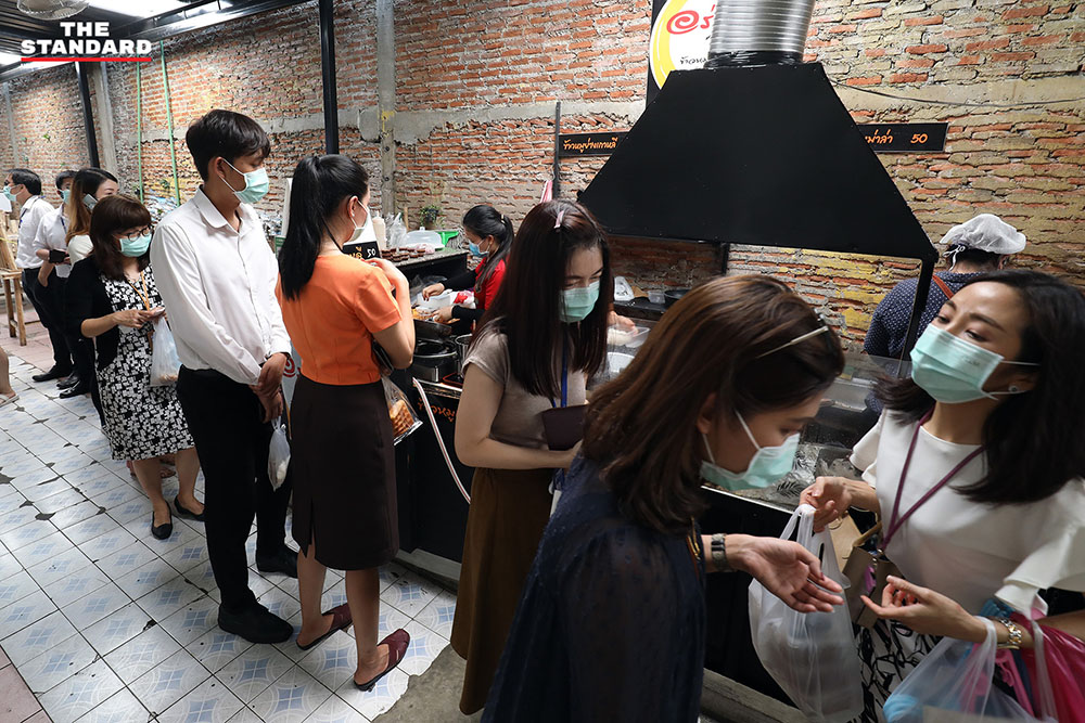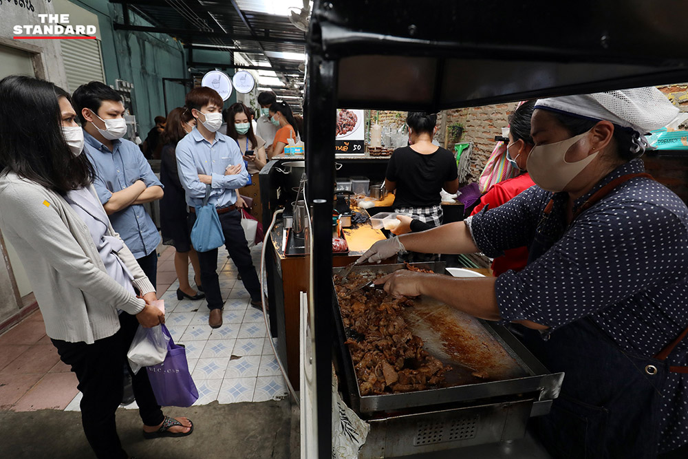 ข้ามมาที่ซอยละลายทรัพย์ ย่านสีลม ย่านชาวออฟฟิศตึกสูง ส่วนใหญ่ลงมาซื้ออาหารจากร้านประจำแทนการนั่งรับประทาน หอบหิ้วแกงถุง เมนูอาหารที่ชอบขึ้นไปรับประทานบนออฟฟิศที่จัดโซนปลอดภัยและมีมาตรการความสะอาดเพื่อรับประทานในระหว่างพักกลางวันก่อนเดินหน้าลุยงานต่อ ย่านนี้เราพบว่าร้านอาหารดังๆ ให้พนักงานออกมาเสนอขายอาหารหน้าร้าน กวัดแกว่งเมนูที่น่าสนใจ เรียกลูกค้าให้สั่งกลับไปรับประทาน เป็นอีกบรรยากาศที่ไม่ค่อยเห็น และคงจะได้เห็นแบบนี้กันไปอีกระยะหนึ่งจนกว่าพิษภัยของโควิด-19 จะตายจากเราไป