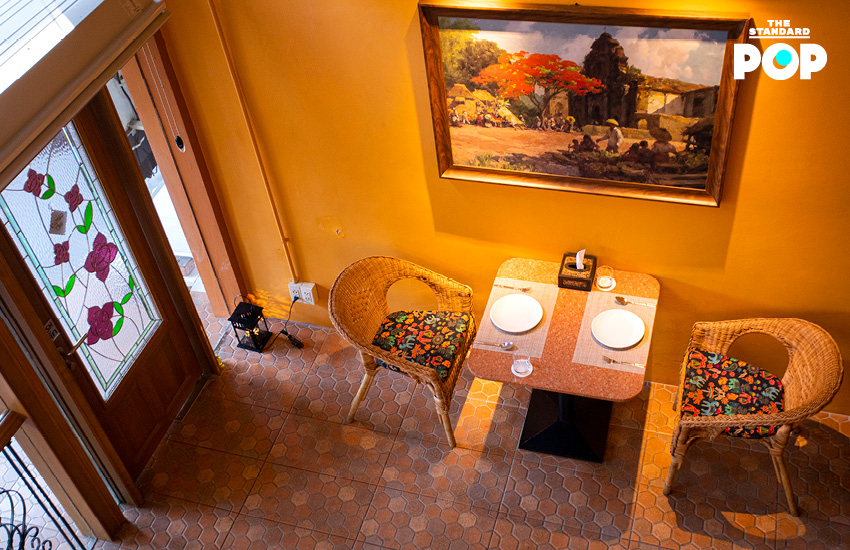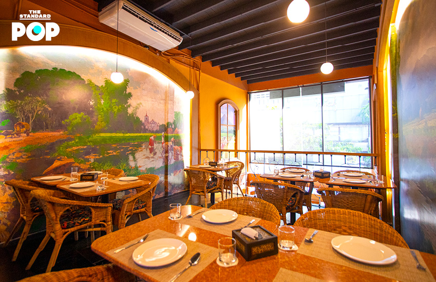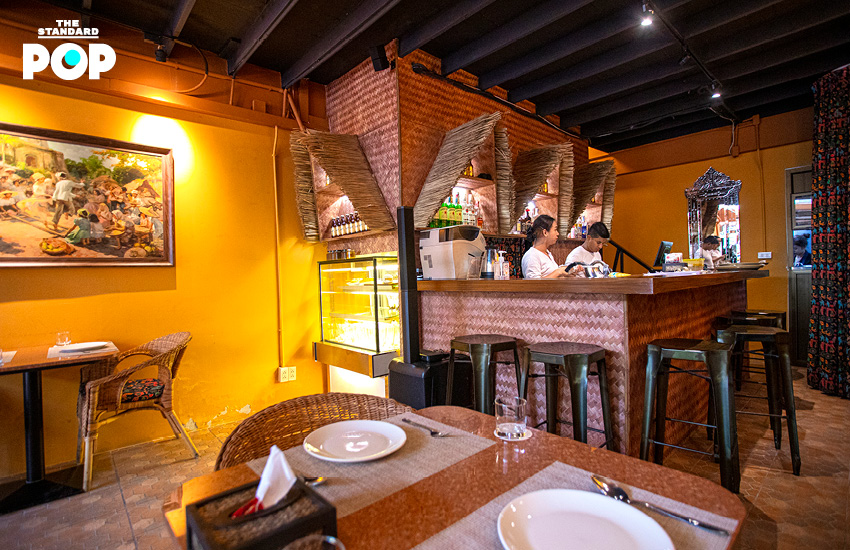 เมื่อเปิดประตูไม้บานเล็กเข้ามา เราจะเจอบรรยากาศอบอุ่นของแสงไฟสีส้ม เก้าอี้หวาย ลวดลายของโซฟา กระเบื้องที่ใช้ในร้าน ภาพเขียนแบบที่เห็นกันได้บ่อยๆ ในฟิลิปปินส์ ชั้นวางขนมปังหลากชนิด และตู้โชว์ขนมหวานที่ชวนให้เราไปเกาะดู