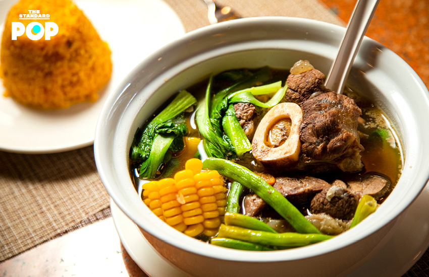 มาดูที่กับข้าวกันบ้าง Bulalo (400 บาท) ซุปเนื้อที่ใช้ส่วนขาหน้าของวัวที่ข้างในมีไขกระดูกอยู่ด้วย นำมาต้มกับผักกวางตุ้งและข้าวโพด มีต้นกำเนิดมาจากเมืองทางใต้ของประเทศฟิลิปปินส์ที่นิยมเลี้ยงวัว Bulalo ชามนี้เป็นคอมฟอร์ตฟู้ดที่แท้จริงของชาวฟิลิปปินส์ เพราะไม่ว่าจะทำงานหนัก เหนื่อยล้า เมาค้าง หรือไม่สบาย Bulalo จะทำให้รู้สึกดีขึ้นได้ แต่ละคนก็จะมีวิธีกินที่แตกต่างกัน บางคนก็ใช้ช้อนตัก บางคนก็ใช้หลอดดูด และอย่าลืมกินไขกระดูกเข้าไปด้วยนะ