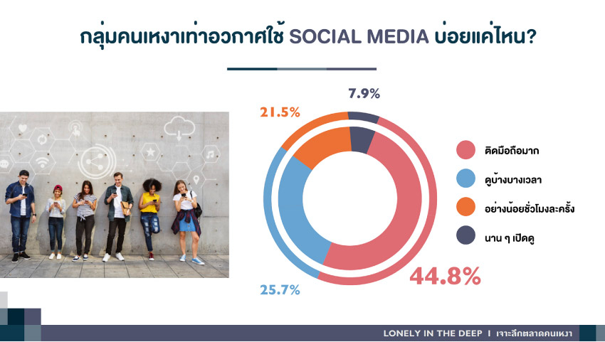 - เข้าถึงโซเชียลมีเดีย เป็นวิธีช่วยคลายเหงาที่เข้าถึงง่าย สามารถสร้างความรู้สึกร่วมกับสังคมเสมือนบนออนไลน์ได้ทุกที่ ทุกเวลา รวมถึงยังเป็นหนึ่งในวิธีการแก้เหงาที่เสียค่าใช้จ่ายน้อยที่สุด โดยคนเหงาชอบใช้ Facebook มากที่สุด 36.7% รองลงมาเป็น LINE 33.0%, Instagram 16.7% และ Twitter 11.9%