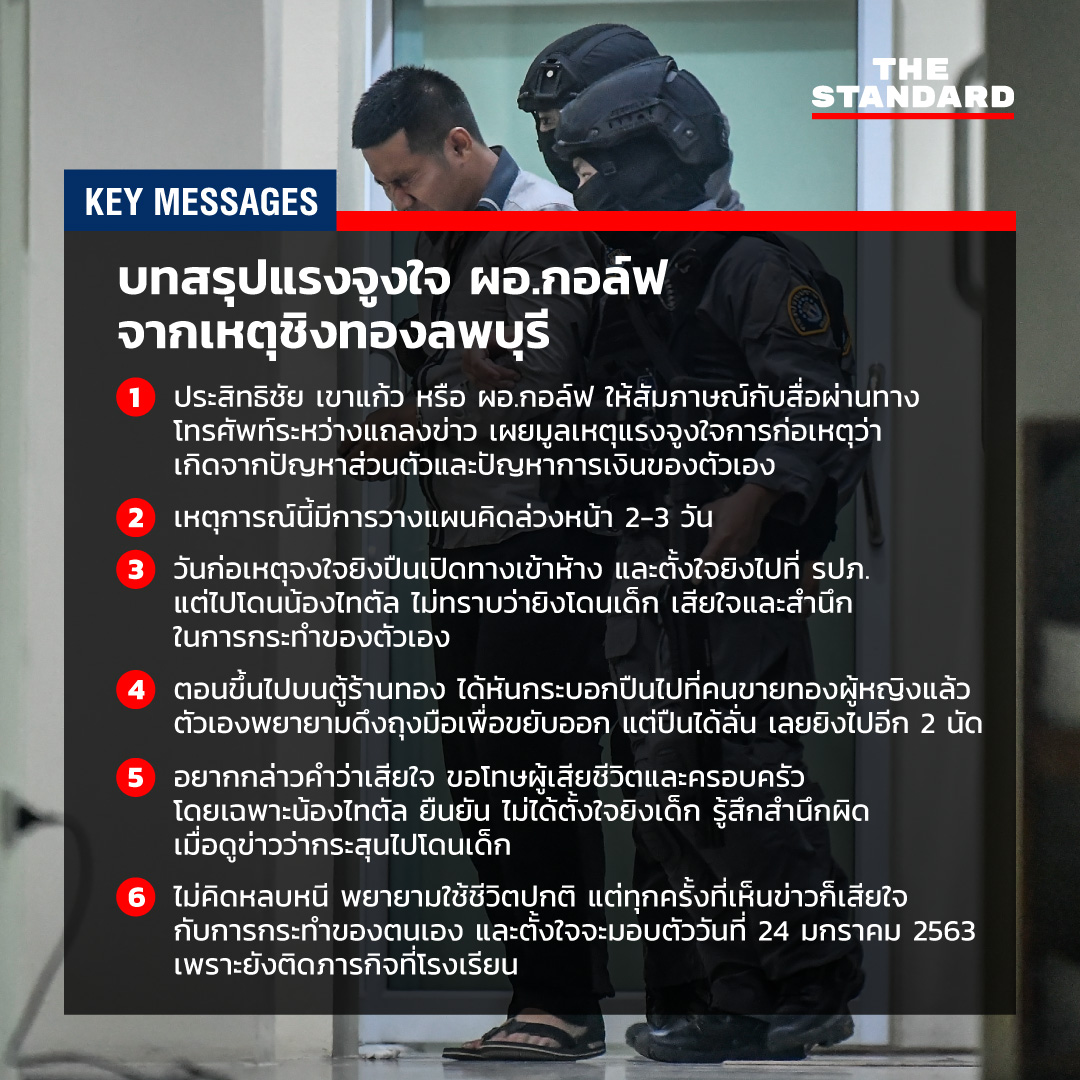 หลังจากที่เจ้าหน้าที่ตำรวจเข้าจับกุมตัวผู้ต้องหาคดีชิงทองที่จังหวัดลพบุรี ล่าสุดมีการตั้งโต๊ะแถลงข่าวถึงแรงจูงใจในการก่อเหตุ และความรู้สึกต่อเหตุการณ์ที่เกิดขึ้นทั้งหมดของ ประสิทธิชัย เขาแก้ว หรือ ผอ.กอล์ฟ ผู้ต้องหาในคดีนี้