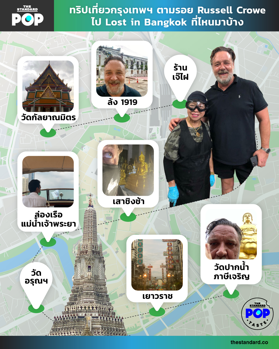 หลังจากดาราชื่อดัง Russell Crowe (รัสเซล โครว์) ได้บันทึกการผจญภัย Lost in Bangkok ผ่านทาง Twitter มาสักพัก ก็ได้เวลาบอกลาประเทศไทยแล้ว THE STANDARD POP จึงถือโอกาสนี้รวบรวมสถานที่ที่ Russell Crowe ไปเที่ยวมาให้ เผื่อใครอยากจะตามรอยกัน!