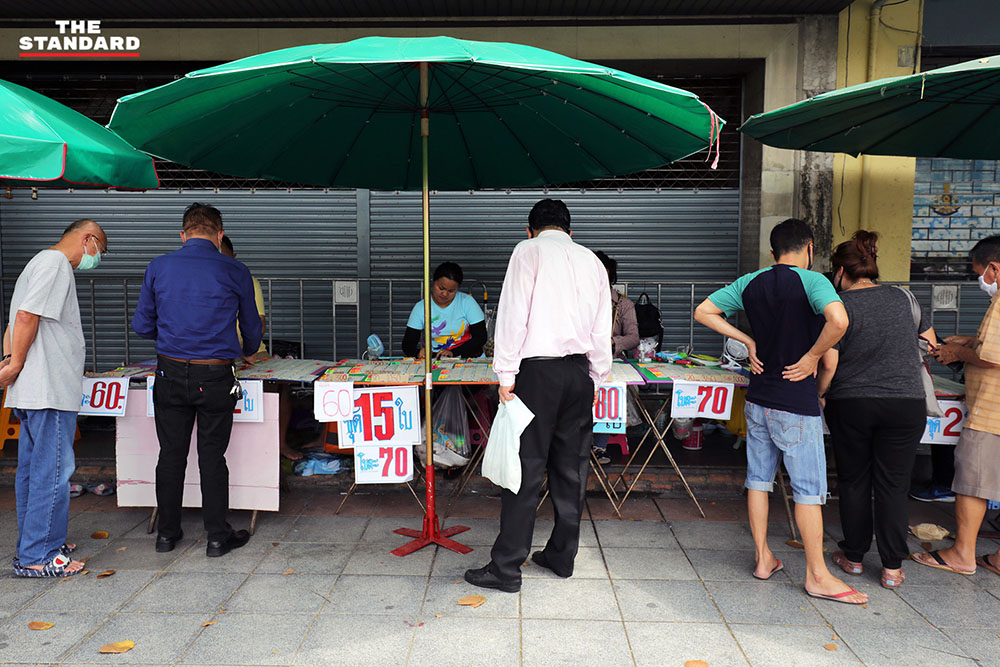 THE STANDARD ลงพื้นที่สำรวจจุดจำหน่ายสลากของคอหวย นักเสี่ยงโชค ที่บริเวณแยกคอกวัว ถนนราชดำเนิน และตลาดวงเวียนใหญ่ เราพบว่าสลากของผู้ค้าหลายเจ้ายังเหลือเต็มแผง ทั้งๆ ที่ในวันพรุ่งนี้จะมีการออกรางวัลแล้ว หากเป็นสถานการณ์ปกติ ผู้ค้ารายหนึ่งเล่าให้เราฟังว่าเลขเด็ดหรือสลากแทบไม่เหลือให้นักเสี่ยงโชคมาเลือกซื้อแล้ว
