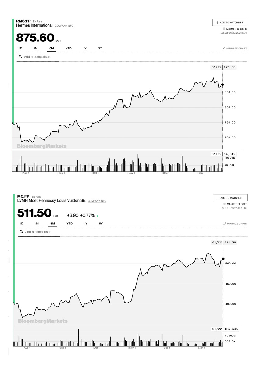 ขณะที่ Hermes International ราคาล่าสุด (22 มกราคม 2564) ราคาอยู่ที่ 875.60 ยูโรต่อหุ้น หรือราว 31,977.29 บาท เพิ่มขึ้น 9.25% จากวันที่ 1 พฤศจิกายน 2563 ที่อยู่ราว 801.40 ยูโรต่อหุ้น หรือราว 29,267.47 บาท โดยจุดสูงสุดอยู่ที่ 897.00 ยูโร หรือราว 32,758.82 บาท เมื่อวันที่ 14 มกราคมที่ผ่านมา