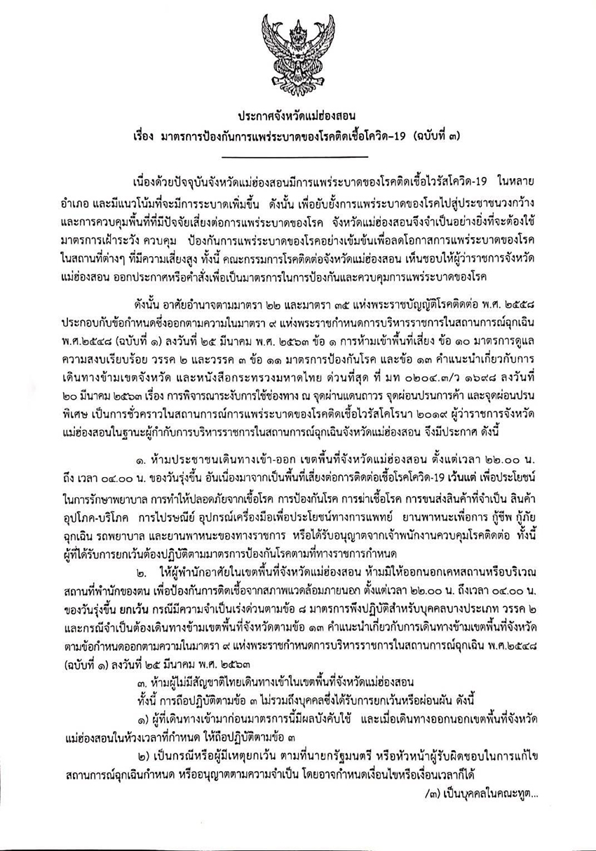 สุวพงศ์ กิติภัทย์พิบูลย์ ผู้ว่าราชการจังหวัดแม่ฮ่องสอน ลงนามในประกาศจังหวัดแม่ฮ่องสอน เรื่อง มาตรการป้องกันการแพร่ระบาดของโรคติดเชื้อโควิด-19 (ฉบับที่ 3) โดยมีเนื้อหาดังนี้