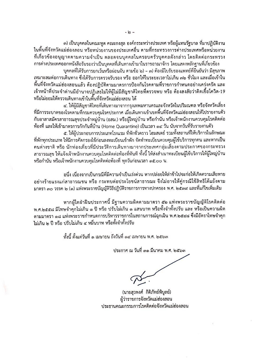 1. ห้ามประชาชนเดินทางเข้าออกเขตพื้นที่จังหวัดแม่ฮ่องสอน ตั้งแต่เวลา 22.00-04.00 น. ยกเว้นเป็นการเดินทางเพื่อประโยชน์ในการรักษาพยาบาล การป้องกันโรค การฆ่าเชื้อโรค การขนส่งสินค้าจำเป็น สินค้าอุปโภคบริโภค การไปรษณีย์ อุปกรณ์เครื่องมือทางการแพทย์ ยานพาหนะเพื่อการกู้ชีพกู้ภัย รถฉุกเฉิน รถพยาบาล และยานพาหนะของทางราชการ หรือที่ได้รับอนุญาตจากเจ้าพนักงานควบคุมโรคติดต่อเท่านั้น
