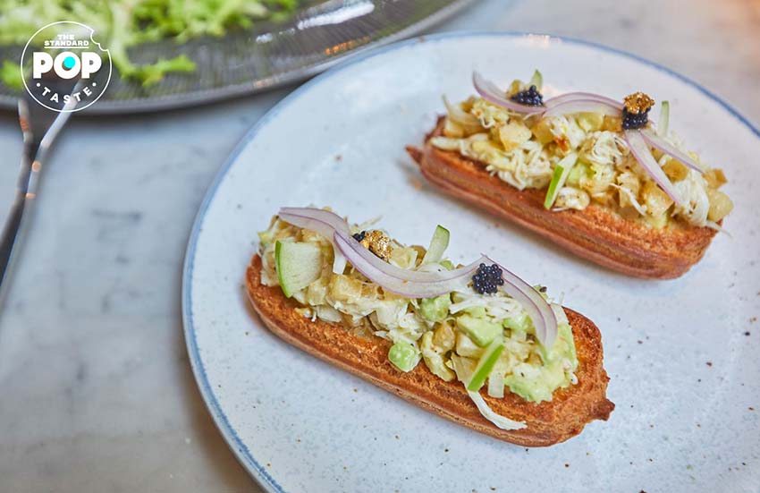 Mademoiselle’s Pomelo Tart (295 บาท) ยำส้มโอสูตรคุณแม่ ที่เลือกใช้แป้งพายชั้นเป็นภาชนะห่อหุ้มยำส้มโอด้านใน ทานกับกุ้ง ไข่ต้ม และ Crème Fraîche ส่วนอีกจานของว่างที่เราชอบคือ เอแคลร์สลัดปู (265 บาท) จานนี้ใช้แป้งชูสอดไส้สลัดปู อะโวคาโด และแอปเปิ้ลเขียว