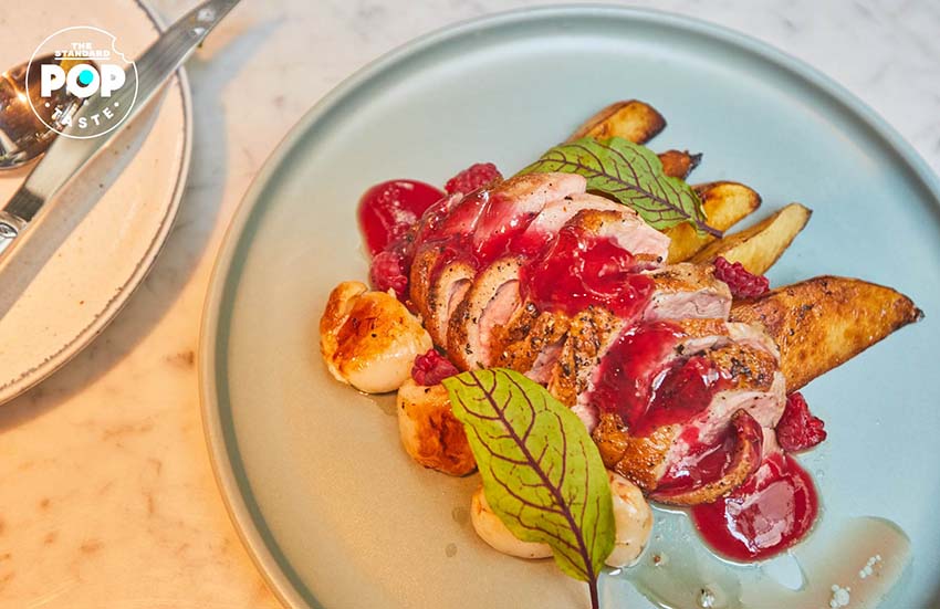 การผสมระหว่างครัวอาหารคาวและอาหารหวานมีให้เราเห็นและเซอร์ไพรส์ในไอเดียตลอดเมนู เช่นเดียวกับจานหลักอย่างอกเป็ด ที่โดยปกติเราคุ้นชินกับการเสิร์ฟอกเป็ดเคียงกับซอสผลไม้เปรี้ยวหวานอยู่แล้ว โจทย์นั้นเลยถูกตีความให้ซับซ้อนอีกเลเยอร์ ด้วยการใช้คอมบิเนชันคลาสสิกอย่าง ‘Ispahan’ หรือ ราสป์เบอร์รี-ลิ้นจี่-กุหลาบ มาเป็นซอสเสียเลย จานนี้ชื่อว่า ‘Ispahan Duck Breast’ (460 บาท)