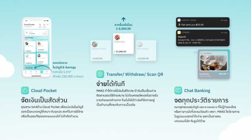 แม้จุดเริ่มต้นของ MAKE หรือเมฆในชื่อเวอร์ชันไทย มาจากความตั้งใจที่อยากจะชวนคนรุ่นใหม่มาใช้งานกระเป๋าสตางค์ (บัญชีธนาคาร) รูปแบบใหม่ที่มีความสะดวกมากขึ้น ใช้งานง่ายมากขึ้น แต่วันนี้ความสามารถของ MAKE กลับเริ่มลอยไปไกลขึ้นเรื่อยๆ แต่ยังคงมองเห็นและจับต้องได้ง่ายเหมือนเคย