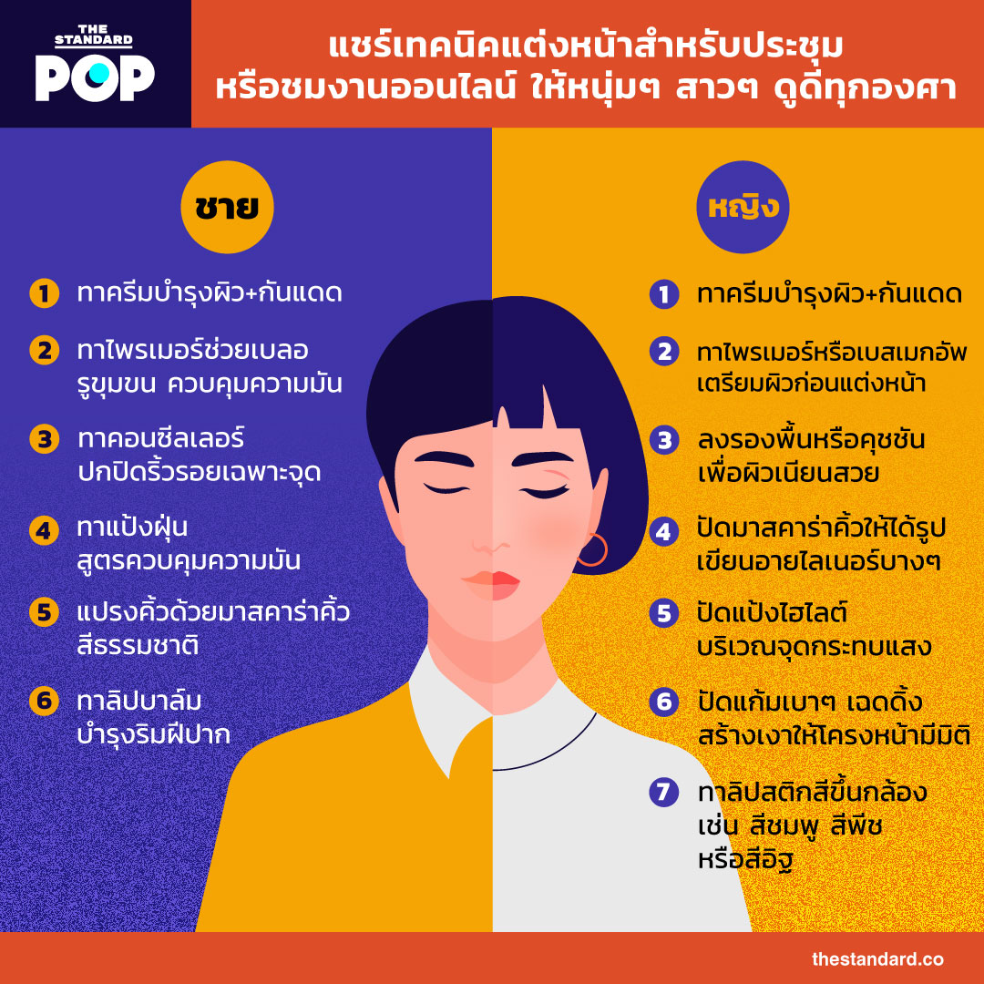 การประชุมงานผ่านแอปพลิเคชันต่างๆ กลายเป็นเรื่องปกติใหม่ในชีวิตประจำวันของคนทำงานไปแล้ว เนื่องจากข้อจำกัดด้านความปลอดภัยที่ยังไม่สามารถให้มีการจัดงานอีเวนต์ หรืองานฟอรัมใหญ่ๆ ที่รวมตัวผู้คนจำนวนมากมาอยู่ในสถานที่เดียวกันได้ เราจึงได้เห็นรูปแบบใหม่ๆ ของงานในลักษณะของ Virtual Event เกิดขึ้น แม้แต่สำนักข่าว THE STANDARD ของเรา ก็กำลังจะมีงานใหญ่อย่าง THE STANDARD ECONOMIC FORUM ระหว่างวันที่ 29-31 พฤษภาคมนี้ สำหรับใครที่มีบัตรพร้อมเข้าชมแล้ว เรามีเทคนิคดีๆ สำหรับใช้แต่งหน้าในการชมงานออนไลน์ แม้แต่ผู้อ่านคนอื่นๆ ที่อาจไม่ได้ชมงานนี้ แต่ต้องมีการประชุมงานผ่านแอปพลิเคชันออนไลน์อื่นๆ ก็สามารถนำไอเดียและเทคนิคไปใช้ได้เหมือนกัน รับรองว่าเมื่อคุณเปิดกล้อง คุณจะดูดีทุกองศาแน่นอน