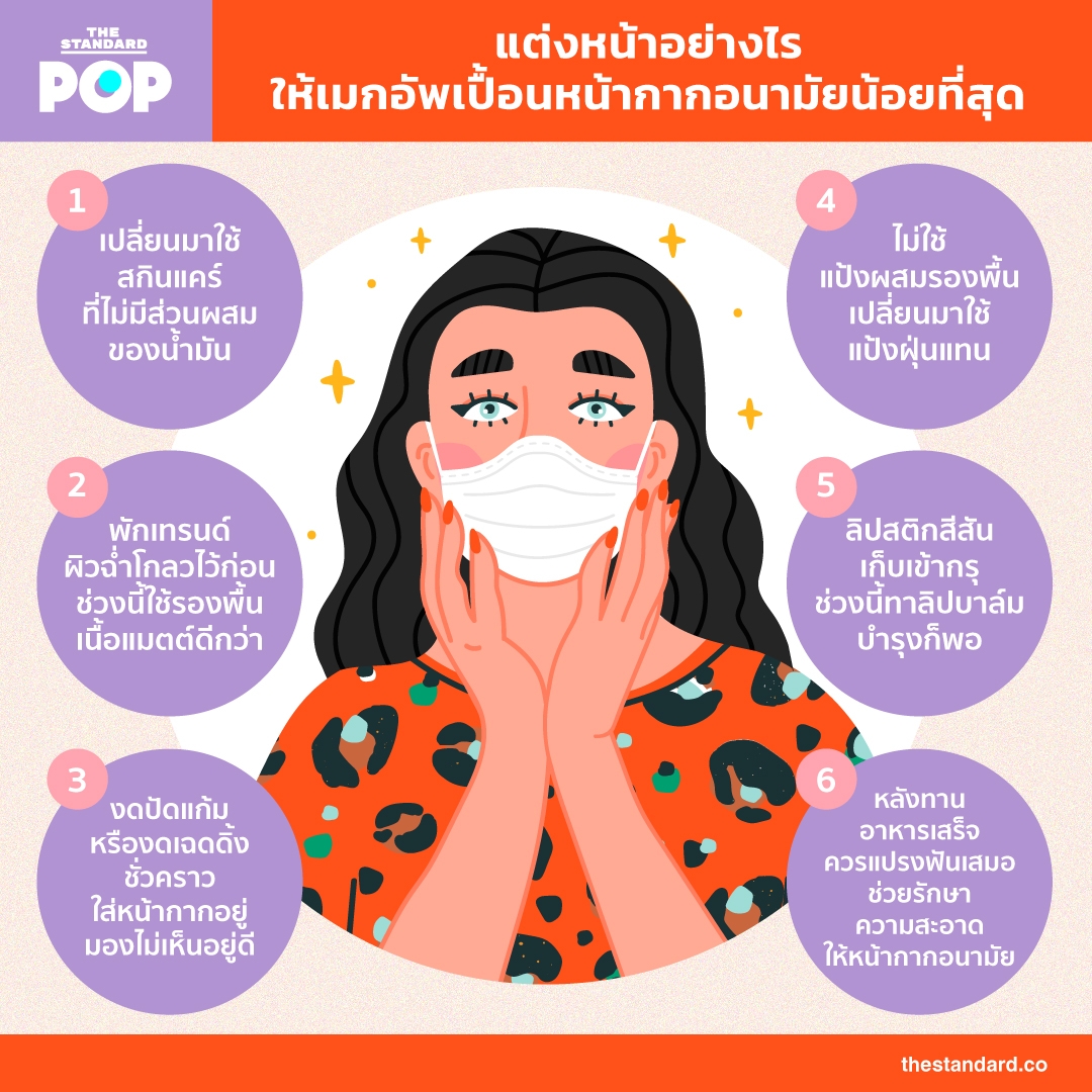 ดูเหมือนว่าเรื่องดูแลรักษาสุขภาพของคนไทยกลายเป็นเรื่องที่ต้องให้ความสำคัญเป็นอันดับหนึ่ง ปัญหาฝุ่นละอองขนาดเล็กอย่าง PM2.5 ยังไม่ทันจะคลี่คลาย ปัญหาใหม่อย่างการป้องกันตัวเองจากไวรัสโคโรนาสายพันธุ์ใหม่ก็เพิ่มเข้ามาอีก ทำให้ชีวิตของคนไทยช่วงนี้มีอีกหนึ่งปัจจัยที่เพิ่มเข้ามาในวิถีชีวิตคือ หน้ากากอนามัย ซึ่งสามารถดูวิธีการใส่หน้ากากอนามัยที่ถูกต้องได้ที่นี่ ขณะเดียวกันหลายคนแม้จะต้องใส่หน้ากากอนามัยอยู่ตลอด แต่ก็ยังต้องแต่งหน้าอยู่ดี ปัญหาที่ตามมาคือ เมกอัพมักจะเลอะหรือเปื้อนหน้ากากอนามัยที่สวมใส่ ไม่ว่าจะเป็นรอยของรองพื้นหรือลิปสติก THE STANDARD จึงมีไอเดียการแต่งหน้าให้เมกอัพเปื้อนหน้ากากอนามัยน้อยที่สุดมาฝาก