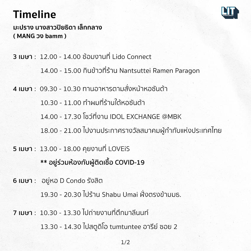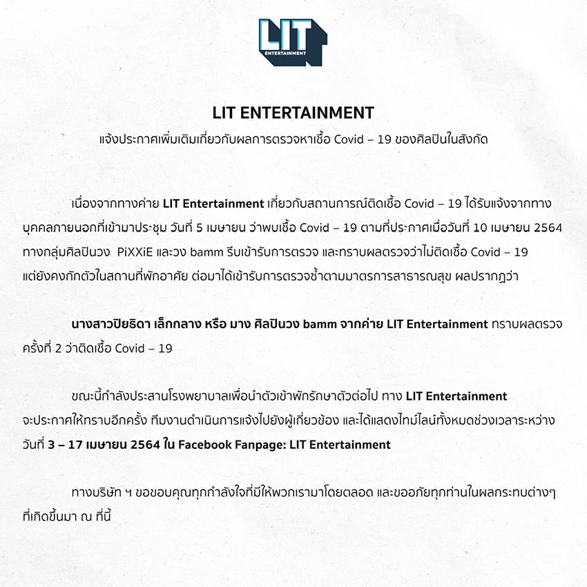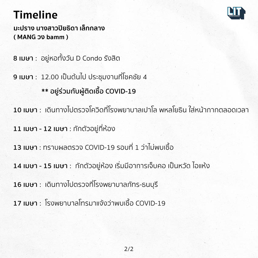 วันนี้ (17 เมษายน) ค่าย LIT Entertainment ได้แจ้งผลการตรวจโควิด-19 รอบที่สองของ มาง-ปิยธิดา เล็กกลาง หนึ่งในสมาชิกวง bamm พบ ‘ติดเชื้อ’ พร้อมเผยไทม์ไลน์ช่วงวันที่ 3-17 เมษายน