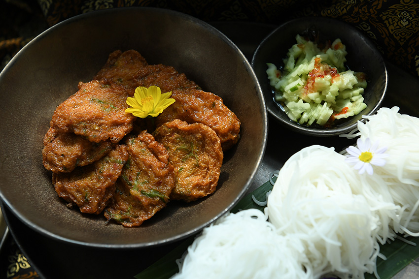 ขนมจีนทอดมันปลา เมนูอาหารที่ชาวเมืองเพชรบุรีนิยมจับคู่ทอดมันกับขนมจีน รับประทานพร้อมด้วยใบกะเพรากรอบ ก่อนจะราดน้ำจิ้มหวานๆ เปรี้ยวๆ อย่างอาจาด ให้รสชาติที่เข้ากัน