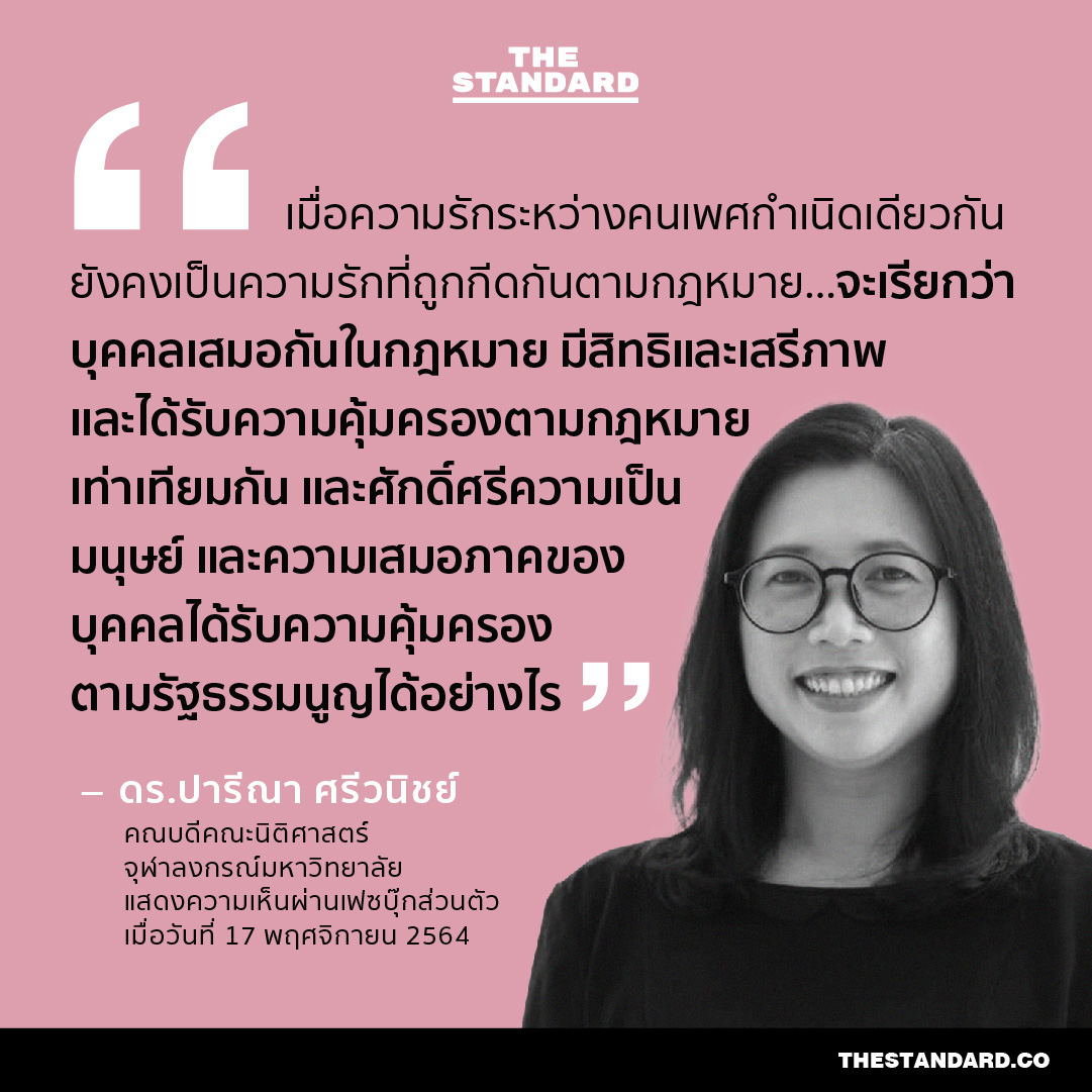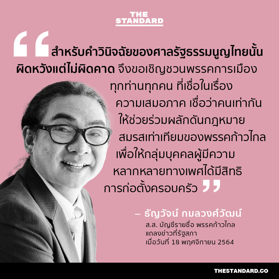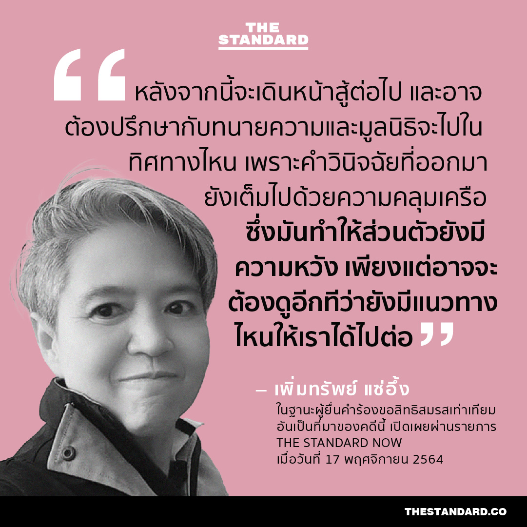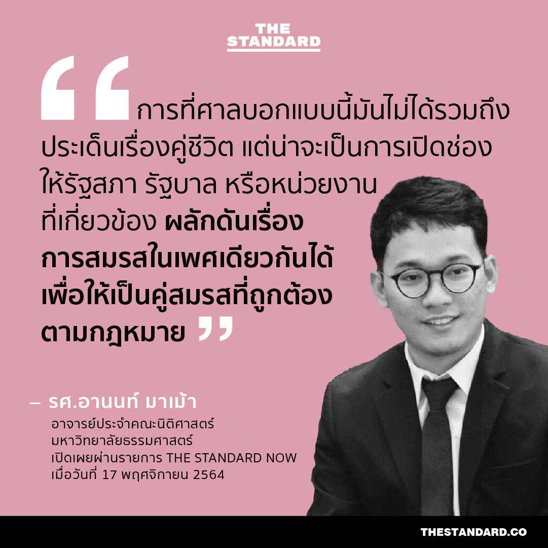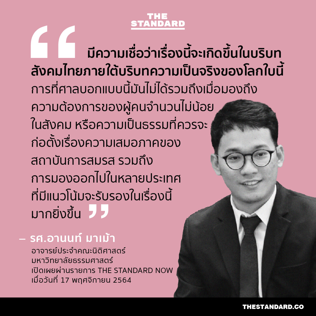 วานนี้ (17 พฤศจิกายน) หลังศาลรัฐธรรมนูญวินิจฉัยว่า ประมวลกฎหมายแพ่งและพาณิชย์ มาตรา 1448 ที่กำหนดการสมรสเฉพาะชาย-หญิง ไม่ขัดต่อรัฐธรรมนูญ ในเวลาต่อมา THE STANDARD ได้พูดคุยกับ รศ.อานนท์ มาเม้า อาจารย์ประจำคณะนิติศาสตร์ มหาวิทยาลัยธรรมศาสตร์ และ เพิ่มทรัพย์ แซ่อึ้ง ในฐานะผู้ยื่นคำร้องขอสิทธิสมรสเท่าเทียมอันเป็นที่มาของคดีนี้ รวมถึงสำรวจความคิดเห็นของอีกหลายคนต่อท่าทีในประเด็นดังกล่าว