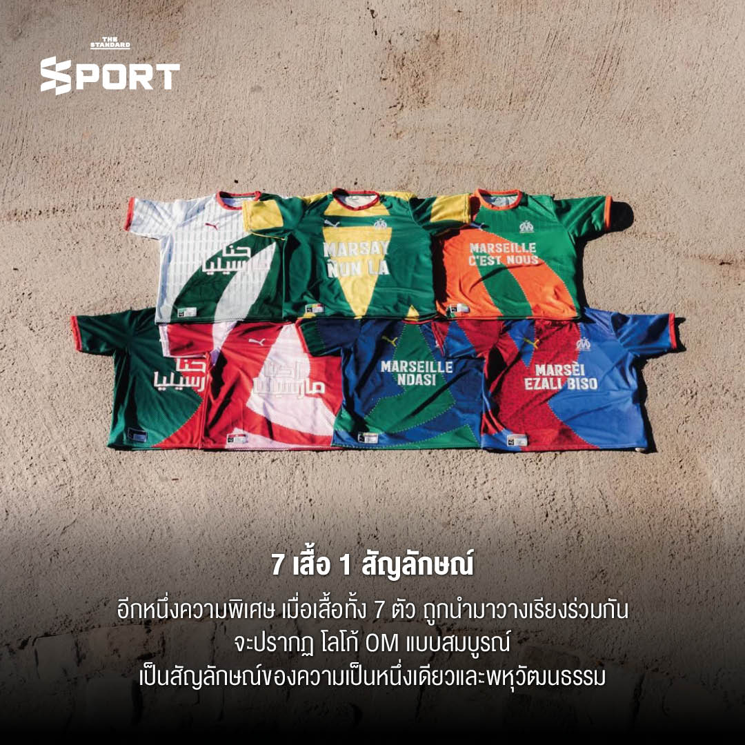 สำหรับตัวเสื้อทั้ง 7 แบบ ถูกเชื่อมโยงด้วยลวดลายที่ได้รับแรงบันดาลใจจาก ‘ลวดเย็บ’ และเมื่อวางรวมกันจะปรากฏเป็นโลโก้ OM เต็มรูปแบบ สื่อถึงความเป็นหนึ่งเดียว และพลังของความหลากหลายทางวัฒนธรรมที่มาร์กเซยยึดถือมาโดยตลอด
