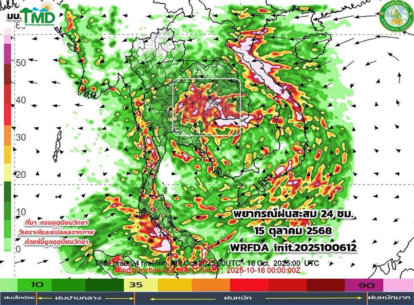 ขณะที่การพยากรณ์ฝนสะสมล่วงหน้า ช่วงวันที่ 7-8 ตุลาคม 2568 ยังคงมีฝนตกหนักบางแห่ง โดยเฉพาะภาคเหนือ และภาคอีสานตอนบน ได้แก่จังหวัดหนองคาย บึงกาฬ เลย น่าน เชียงราย พะเยา