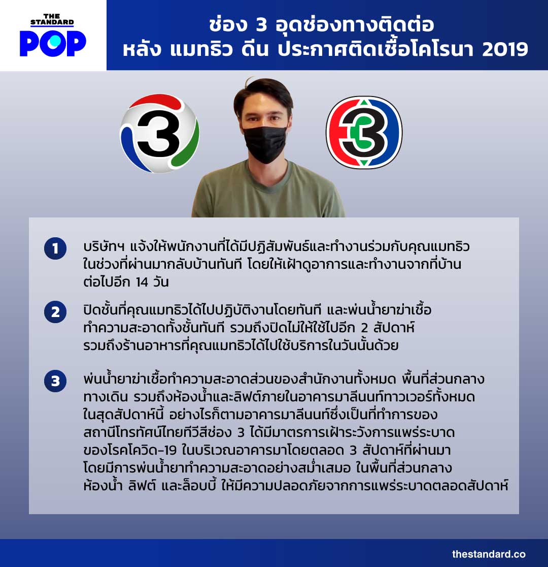 - บริษัทฯ แจ้งให้พนักงานที่ได้มีปฏิสัมพันธ์และทำงานร่วมกับคุณแมทธิวในช่วงที่ผ่านมากลับบ้านทันที โดยให้เฝ้าดูอาการและทำงานจากที่บ้านต่อไปอีก 14 วัน