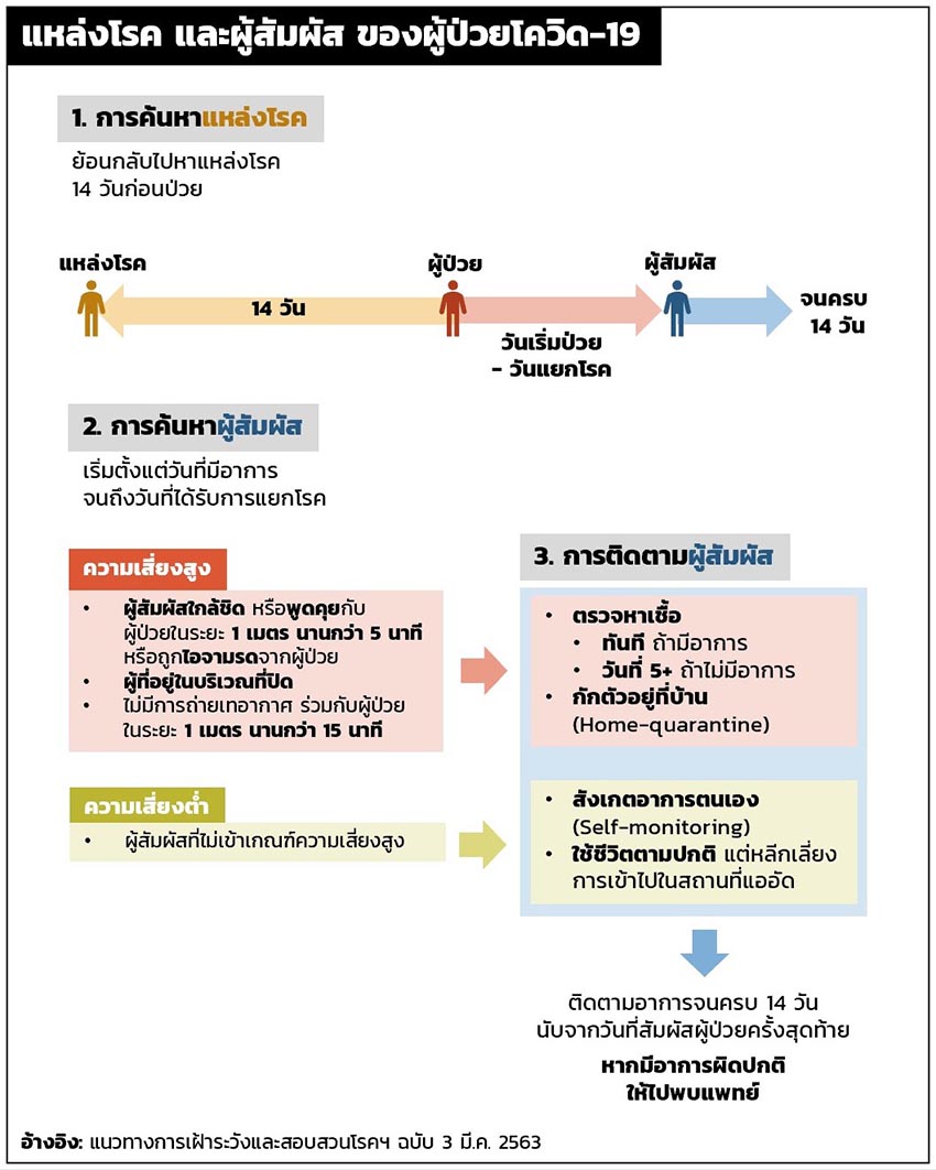 ดังนั้นในแนวทางการสอบสวนโรค จึงแบ่งผู้สัมผัสออกเป็น 2 กลุ่ม คือกลุ่มความเสี่ยงสูงและความเสี่ยงต่ำ โดยผู้สัมผัสความ ‘เสี่ยงสูง’ ได้แก่ ผู้สัมผัสใกล้ชิด เช่น พักอาศัยในบ้านหลังเดียวกัน ผู้ที่พูดคุยกับผู้ป่วยในระยะ 1 เมตร นานกว่า 5 นาที โดนไอจามรดโดยไม่ได้สวมหน้ากากอนามัย หรือนั่งใกล้ผู้ป่วยในสถานที่ปิด เช่น นั่งในรถโดยสารในระยะ 1 เมตร นานกว่า 15 นาที ส่วนที่เหลือจัดเป็นผู้สัมผัส ‘ความเสี่ยงต่ำ’