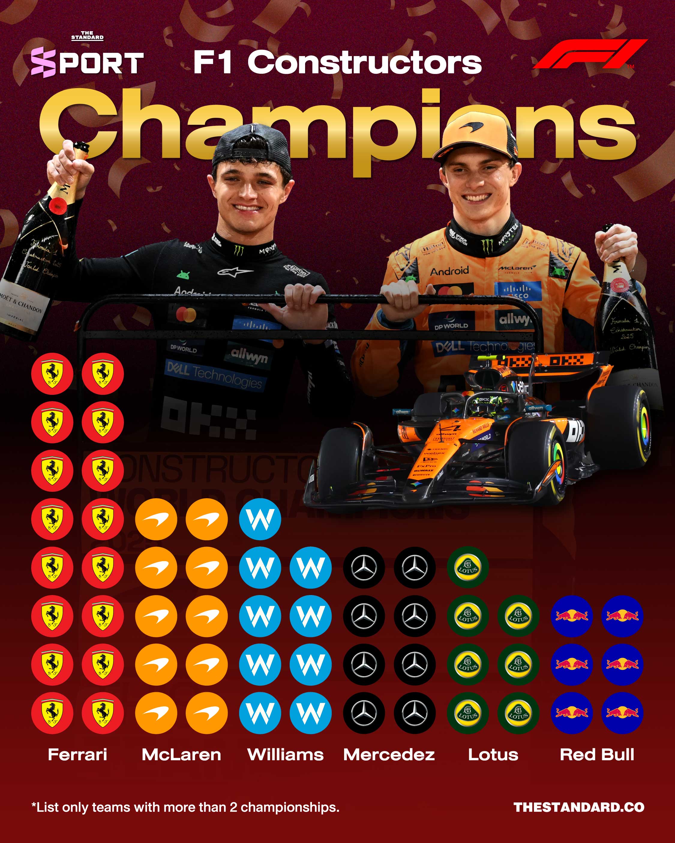 จากการคว้าอันดับ 3 และ 4 ของ แลนโด นอร์ริส กับ ออสการ์ ปิอัสทรี 2 คู่หูนักขับจาก แม็คลาเรน ทำให้ทีม ‘มะละกอ’ ปิดจ็อบคว้าแชมป์โลกประเภทผู้ผลิตได้สำเร็จเป็นปีที่ 2 ติดต่อกัน