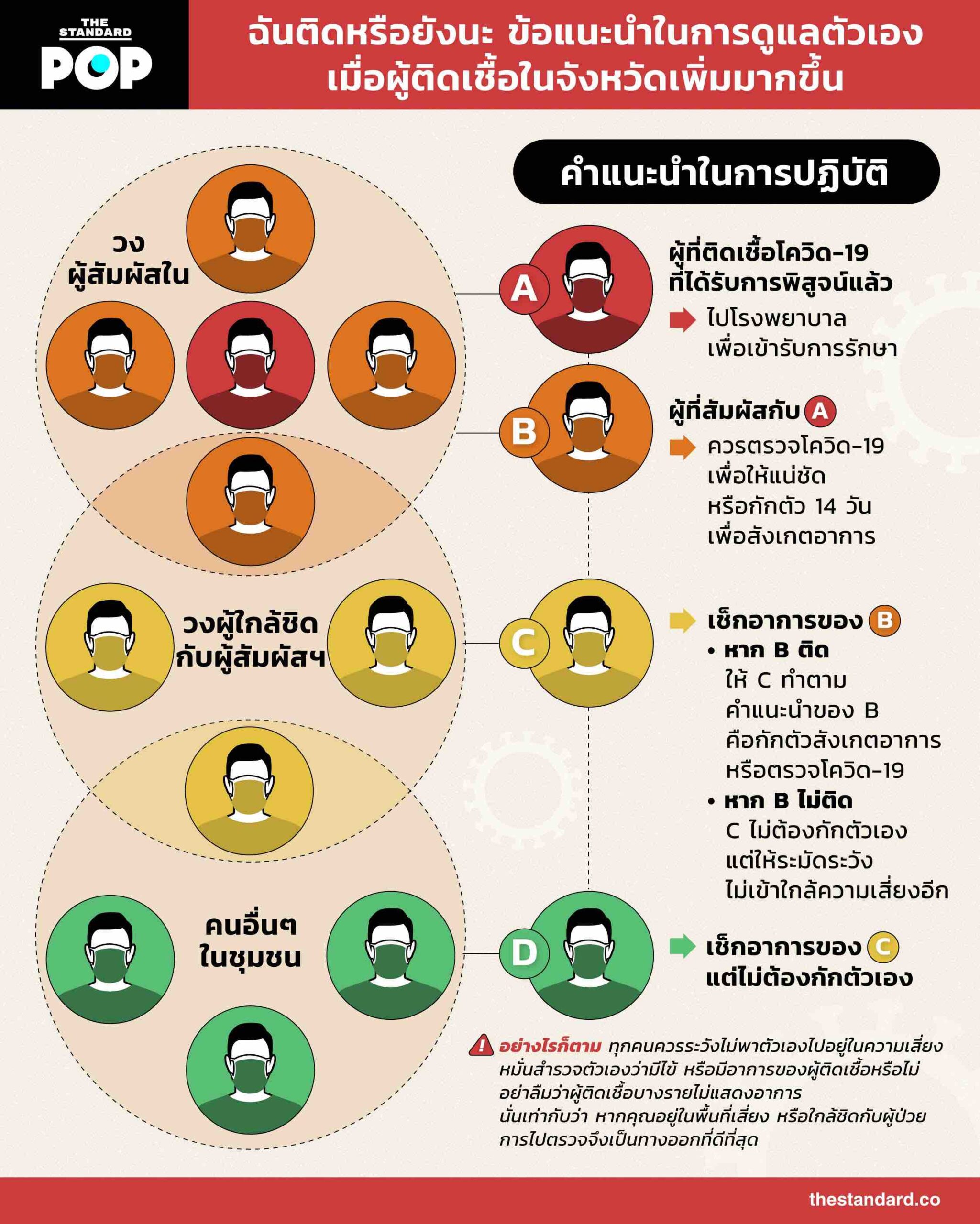 - วงที่ 1 เสี่ยงต่ำ ไม่ต้องกักตัว แต่ให้หลีกเลี่ยงสถานที่แออัด สังเกตอาการตนเอง (Self-monitoring) จนครบ 14 วัน หากมีอาการ ถึงจะไปตรวจหาเชื้อ คือไม่จำเป็นต้องตรวจหาเชื้อทุกคน