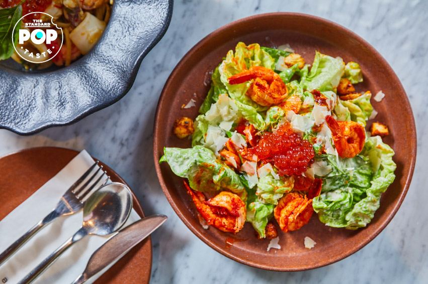 เราเริ่มต้นที่จานสลัด Homemade Meat & Spice Salad with Gambas (320 บาท) สลัดจานโตที่ทวิสต์ความเป็นซีซาร์สลัดด้วยน้ำสลัดซีซาร์สูตรของทางร้านที่ออกรสเผ็ดนิดๆ เติมความเผ็ดด้วยกุ้งกัมบาส กุ้งผัดกับพริกแห้งและกระเทียม และท็อปด้วยอิคุระด้านบน