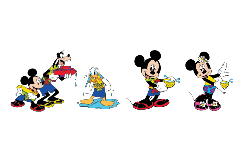 วันสงกรานต์ หรือวันปีใหม่ไทย ที่ถือเป็นหนึ่งในเทศกาลที่ยิ่งใหญ่ที่สุดของประเทศไทย และเป็นงานเทศกาลรื่นเริงของคนไทยที่คนทั่วโลกรู้จัก จะถูกนำมาบอกเล่าแบบน่ารักสดใสผ่านมิคกี้ เมาส์และผองเพื่อน โชว์ลีลาการสาดน้ำสงกรานต์ ในชุดสีโทนเย็นอย่าง สีชมพู สีเขียวอ่อน สีเหลือง