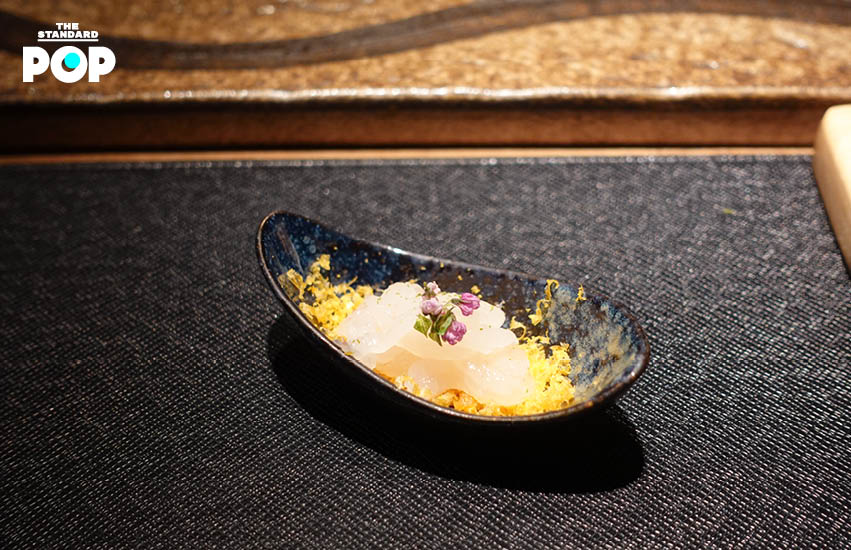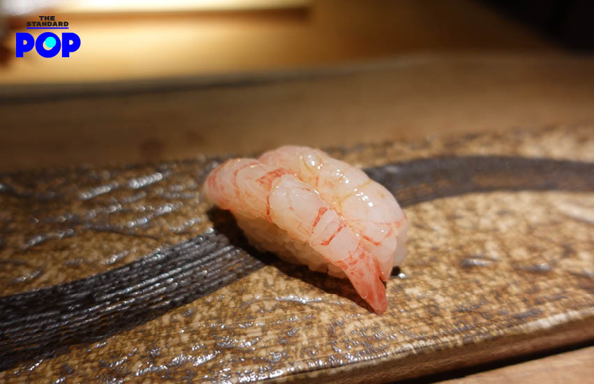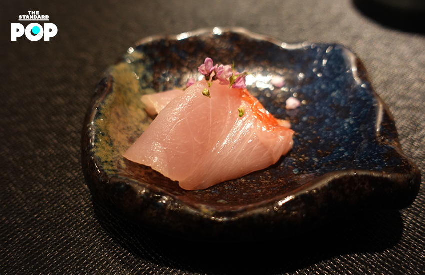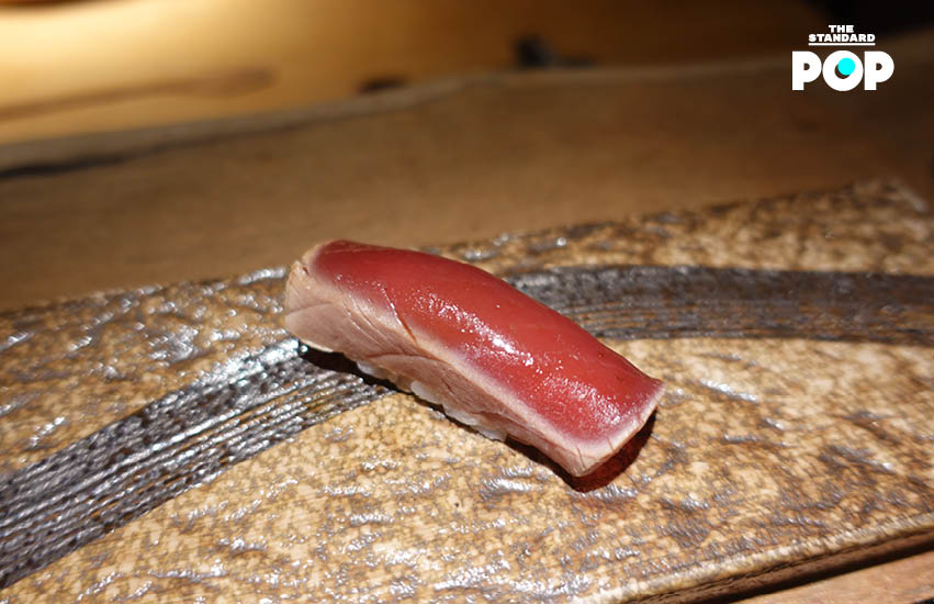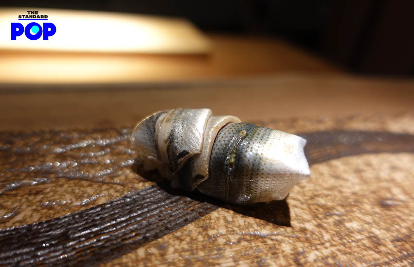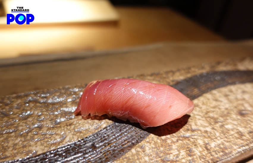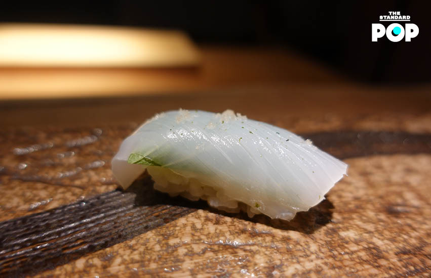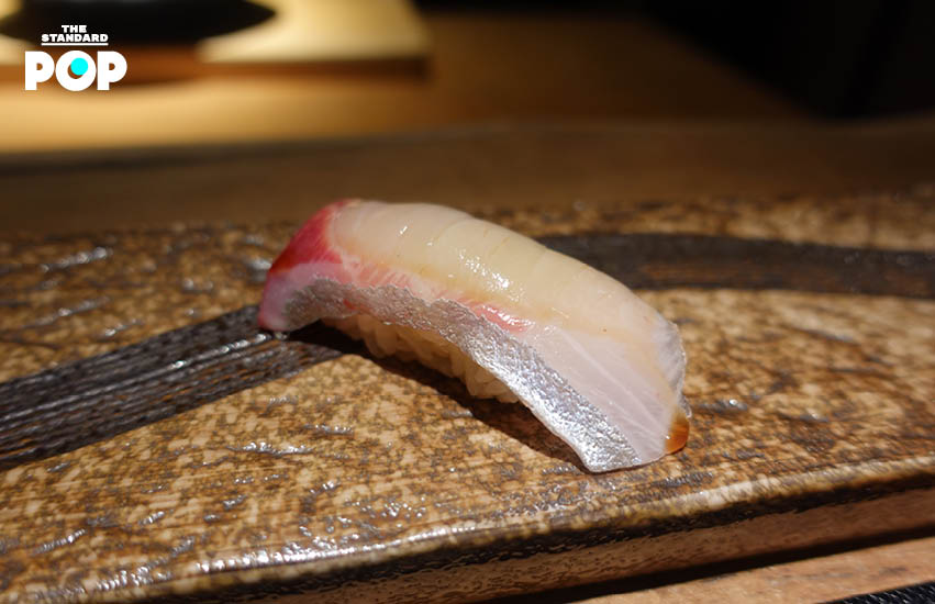 เริ่มเข้าสู่ซูชิเดี่ยว คำแรกมาเป็นปลาชิมะอาจิ หรือ ปลาคาดลาย ปลาเนื้อขาวที่จับไม่ได้ง่ายๆ ตัวปลามีความกรอบหนึบหวาน เมื่อกินคู่กับข้าวต่างสายพันธ์ุที่เชฟคัดสรรมาโดยเฉพาะ จึงช่วยเสริมรสชาติได้เป็นอย่างดี