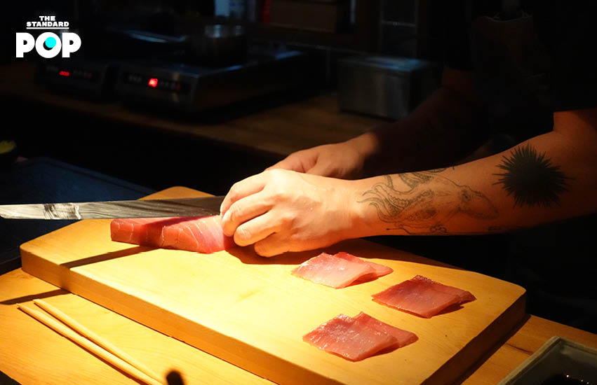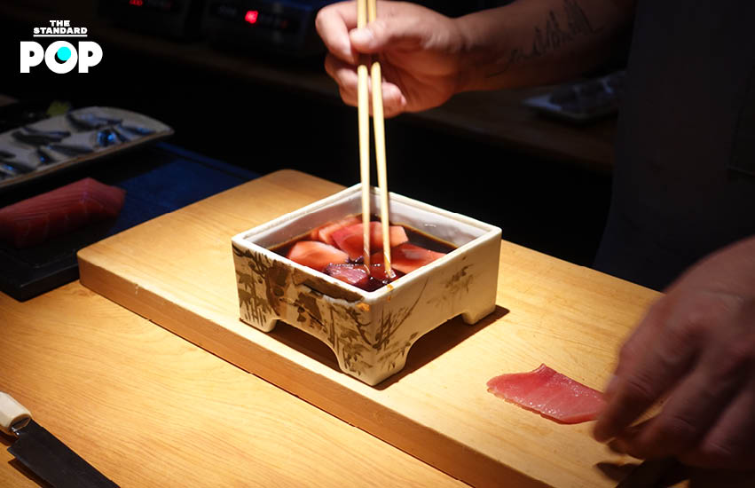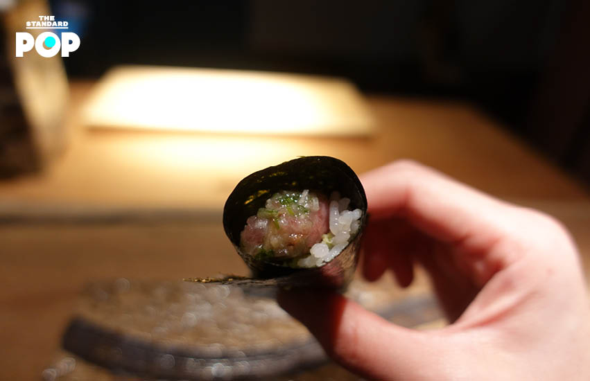 ส่วนใหญ่คนมักเสิร์ฟโรลเป็นคำท้ายๆ เพราะกลัวลูกค้าจะไม่อิ่มกัน แต่เชฟแรนดี้กลับมองว่าจริงๆ แล้ว ทูน่าโรลมีศักยภาพเพียงพอที่จะเป็นมากกว่าคำที่ช่วยให้อิ่มท้อง เชฟเลือกทูน่าส่วนที่มีความมันค่อนข้างมาก นำมาสับให้ละเอียด จากนั้นคลุกเคล้ากับหัวไชเท้าดองรมควัน