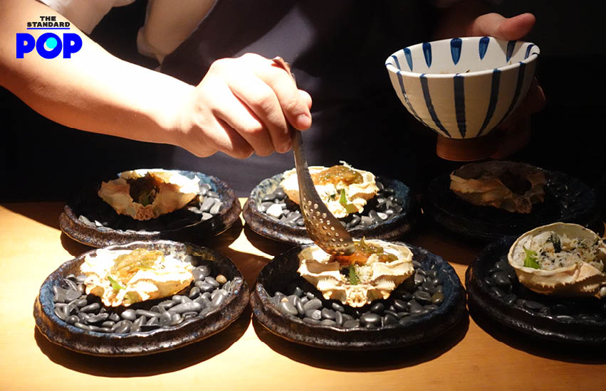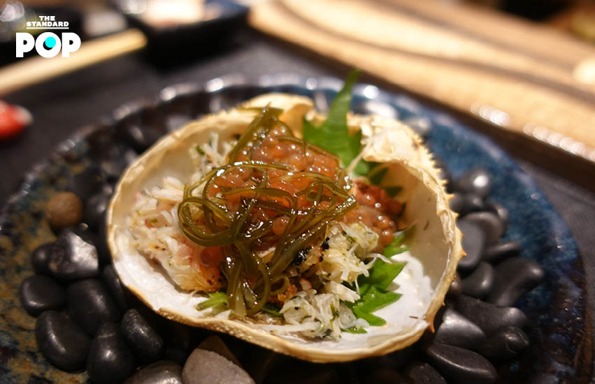 ปูขนนึ่งสาเก เมื่อเชฟนำเนื้อปูมาผสมกับข้าวและสาหร่าย จากนั้นใส่กลับไปในกระดองปูแล้วย่างด้วยถ่าน เพื่อเรียกกลิ่นหอมๆ ก่อนเสิร์ฟโรยหน้าด้วยไข่จากปลาเทราต์ ที่ปรุงรสด้วยสาหร่ายคอมบุ โชยุ และสาเก