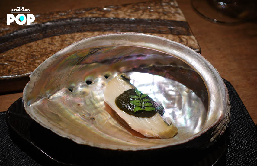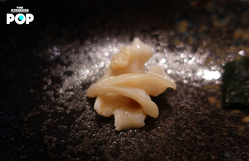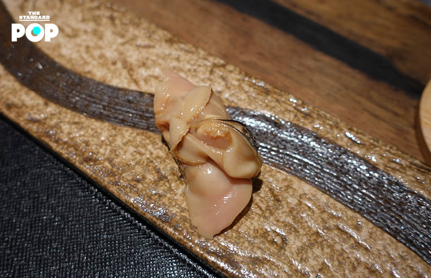 ต่อด้วยหอยประจำหน้าร้อนที่ก่อนเสิร์ฟเชฟได้นำเนื้อหอยไปตีกับเขียงไม้ ซึ่งเป็นเทคนิคที่ใช้ในการกระตุ้นกล้ามเนื้อเพื่อทำให้เนื้อเด้งฟูขึ้นมา หลังกินหอยจนหมด เชฟแนะนำให้หยิบสาหร่ายวากาเมะที่อยู่ในชามซับน้ำที่ไหลมาจากตัวหอย เพื่อซึมซับรสชาติแห่งท้องทะเล