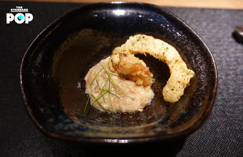 แม้จะเป็นหูฉลาม แต่เชฟเลือกใช้หูฉลามที่ได้มาจากโรงงานที่นำฉลามทั้งตัวมาทำเป็นวัตถุดิบปรุงอาหาร ถือเป็นจานทดลองที่เชฟอยากนำวัตถุดิบจีนๆ มาใช้ในอาหารญี่ปุ่น