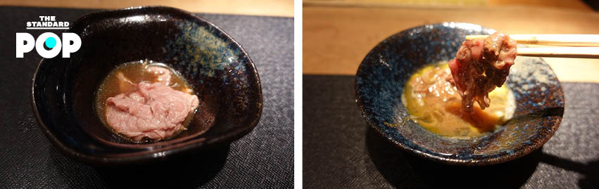 สองจานนี้เป็นเมนูพิเศษที่เชฟอยากให้ลิ้มลอง ได้แก่ ชาบูเนื้อริบอาย และสุกี้ยากี้ที่ใช้เนื้อริบอายแคปซึ่งเป็นสูตรคันไซ หากใครสนใจแนะนำให้แจ้งล่วงหน้าตั้งแต่โทรจอง