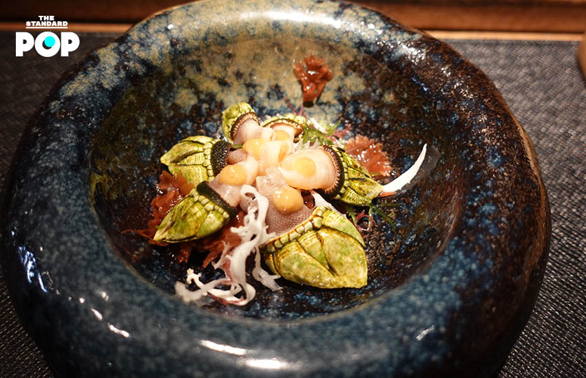 เบรกจากข้าวมาเป็น หอยตีนเต่า หรือบางคนเรียก หอยมือเต่า ที่เชฟนึ่งด้วยน้ำที่ได้จากการนึ่งปูจึงออกรสเค็ม ให้ความรู้สึกถึงทะเล ก่อนตัดแต่งตัวหอยให้มีลักษณะคล้ายตีนเต่า จัดเรียงมาในชามที่รองด้วยสาหร่าย วิธีกินให้เล็มเนื้อด้านนอก จากนั้นใช้ตะเกียบคีบเนื้อด้านในที่กรุบๆ ออกมากินต่อ ด้านบนเหยาะด้วยซอสมิโซะสูตรพิเศษ
