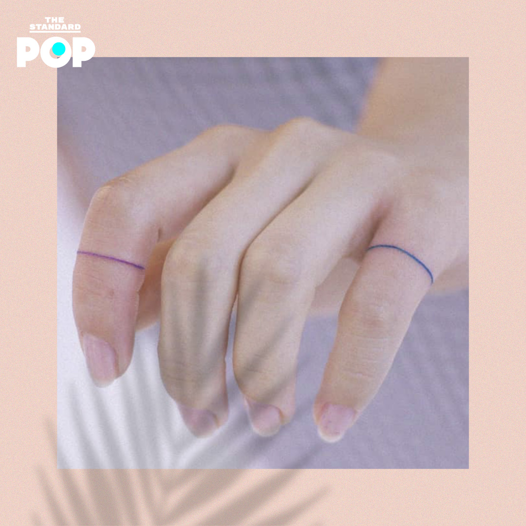 3. รอยสักนี้ใช้หมึกสองเฉดสีคือสีม่วงและสีน้ำเงิน สักเป็นเส้นเล็กๆ รอบนิ้วชี้และนิ้วก้อย มองผิวเผินเหมือนกับใส่แหวนมินิมัลอยู่จริงๆ น่ารักมาก