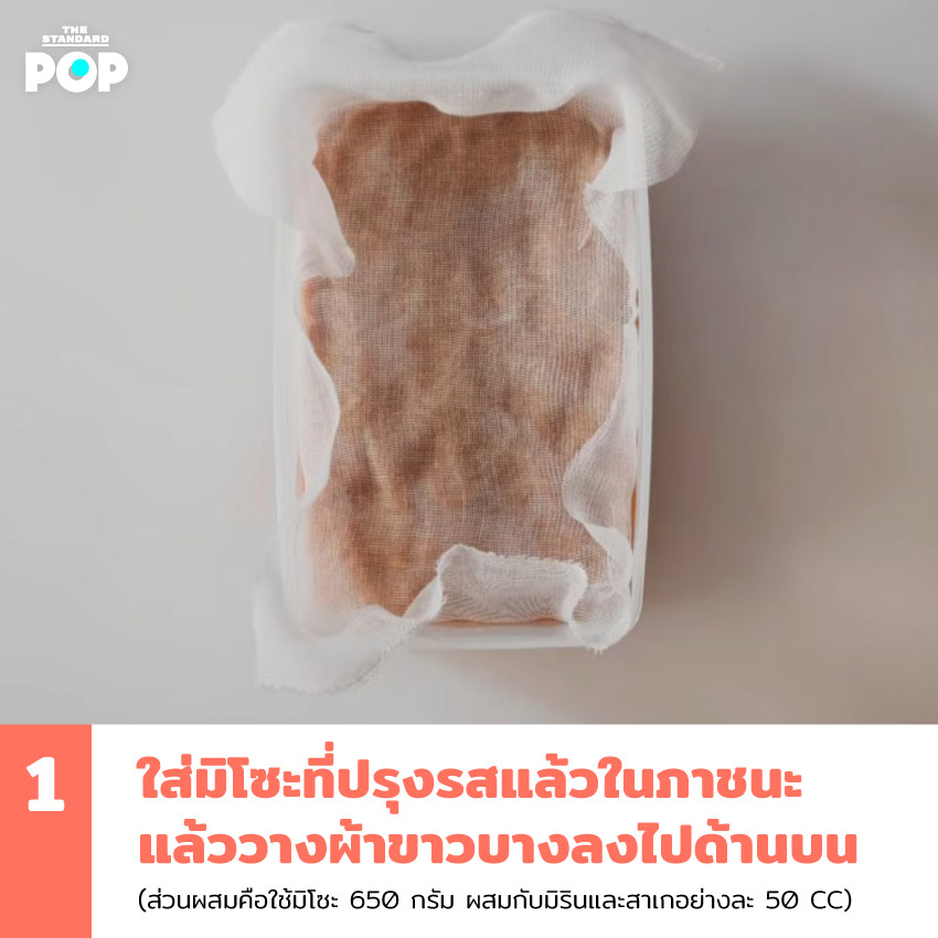 - ใส่มิโซะที่ปรุงรสแล้วในภาชนะ แล้ววางผ้าขาวบางลงไปด้านบน (ส่วนผสมคือใช้มิโซะ 650 กรัม ผสมกับมิรินและสาเกอย่างละ 50 CC)