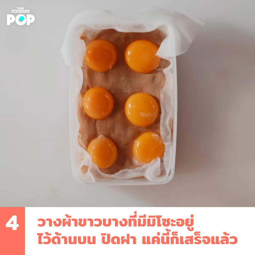 - แยกไข่แดงออกจากไข่ขาว แล้วค่อยๆ วางไข่แดงลงไปบนรอยบุ๋ม ไข่แดงจะได้ไม่แตก