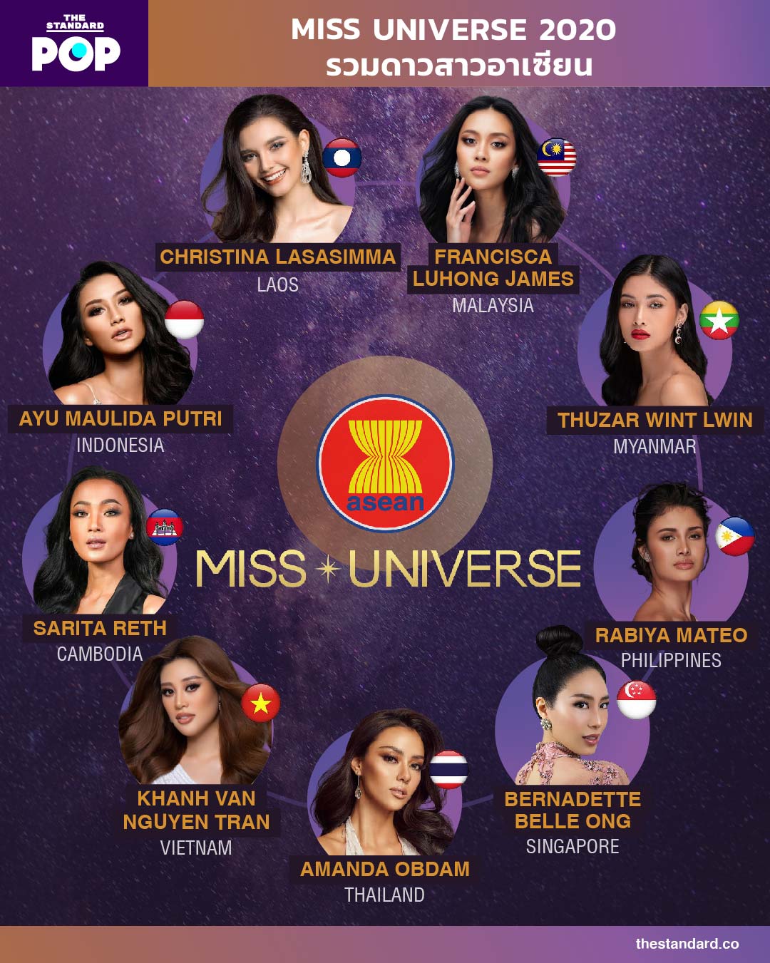 ‘อาเซียน’ ถือเป็นอีกหนึ่งภูมิภาคที่โดดเด่นบนเวที Miss Universe ไม่แพ้ลาตินอเมริกา โดย 9 ใน 10 ประเทศของประชาคมแห่งนี้ได้ส่งสาวงามเพื่อชิงชัยมงกุฎบนเวทีจักรวาล ยกเว้นเพียงประเทศบรูไนเท่านั้น