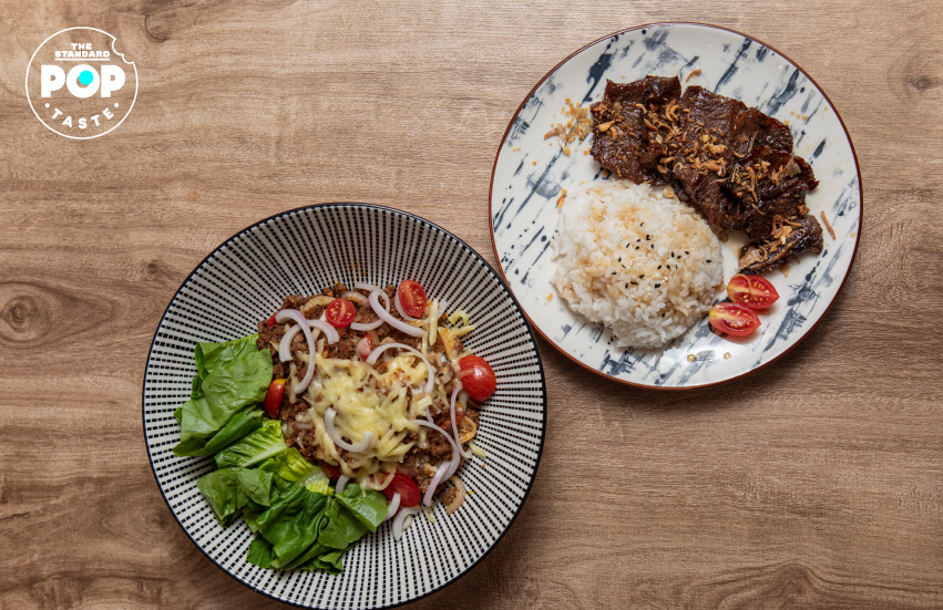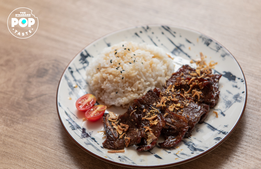 มาถึงเมนูข้าวกันบ้าง กับเมนูข้าวขายดี ข้าวเนื้อซี่โครงย่างซอสญี่ปุ่น (235 บาท) ที่เลือกใช้เนื้อคารุบิหรือเนื้อส่วนซี่โครงสไลซ์บางมาทากับซอสที่ทำเอง เสิร์ฟกับข้าว เป็นเมนูที่ลูกค้าสั่งเยอะที่สุดในบรรดาเมนูข้าว หรือถ้านึกสนุกขึ้นมาก็อยากให้ลอง ข้าวหน้าเนื้อผัดซอสทาโก้ (159 บาท) โดยปกติแล้ว ทาโก้จะมาในรูปแบบแป้งกรอบ แต่ด้วยความเป็นคนไทยก็อยากลองกินกับข้าว เลยลองทำออกมาในรูปแบบของตัวเอง เนื้อสับผัดกับกระเทียม ใส่เครื่องเทศ ชีส หัวหอม มะเขือเทศ ออกมาเป็นเมนูแปลกใหม่ที่ลองแล้วจะติดใจ