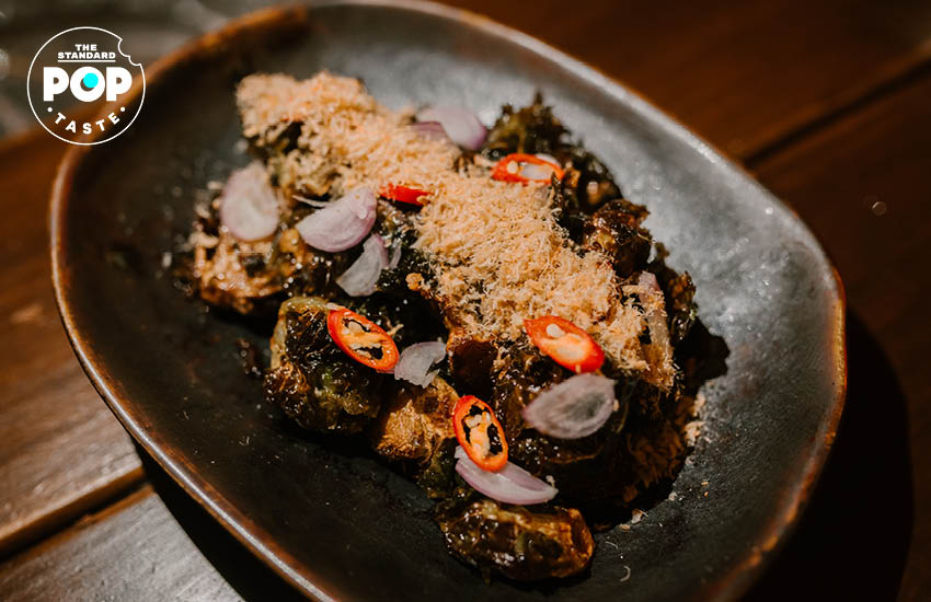 เพิ่มอีกสักอย่าง Brussels Nam Pla Waan (250 บาท) เมนูพิเศษจากก๊วนเพื่อน เชฟ Dylan Eitharong ร้าน Haawm ผักบรัสเซลส์สเปราต์ผัดน้ำปลาหวานจนกึ่งสุกกึ่งไหม้ โรยผงกุ้งแห้งรมควันเพิ่มกลิ่นหอมและรสนัว