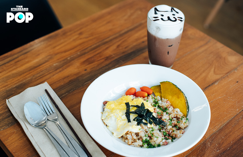 อาหารของคาเฟ่แมวแห่งนี้ส่วนใหญ่เป็นอาหารญี่ปุ่นแท้ๆ ที่ปรุงโดยเจ้าของร้านที่เป็นชาวญี่ปุ่น อย่าง ‘Mohu Mohu Fried Rice’ (159 บาท) จานนี้ เป็นข้าวผัดที่ให้รสชาติแบบบ้านๆ เหมือนกับนั่งกินอยู่ในบ้านแสนอบอุ่นของครอบครัวชาวญี่ปุ่น หรือจะเป็น ‘Omu Curry Rice’ (199 บาท) ข้าวห่อไข่เสิร์ฟพร้อมแกงกะหรี่ญี่ปุ่น ส่วนเครื่องดื่มก็มีให้เลือกหลากหลาย เครื่องดื่มบางแก้วจะมีกิมมิกน่ารักๆ อย่างการวาดรูปแมวลงไปบนฟองนมเหมือนกับ ‘Iced Chocolate’ (110 บาท) แก้วนี้ นอกจากนี้ยังมีเมนูขนมทั้งขนมญี่ปุ่นอย่าง ‘Mochi Kinako Sundae’ (125 บาท) และขนมยอดฮิตประจำคาเฟ่อย่าง ‘Caramel Honey Toast’ (165 บาท) ก็น่าสนใจไม่แพ้กัน