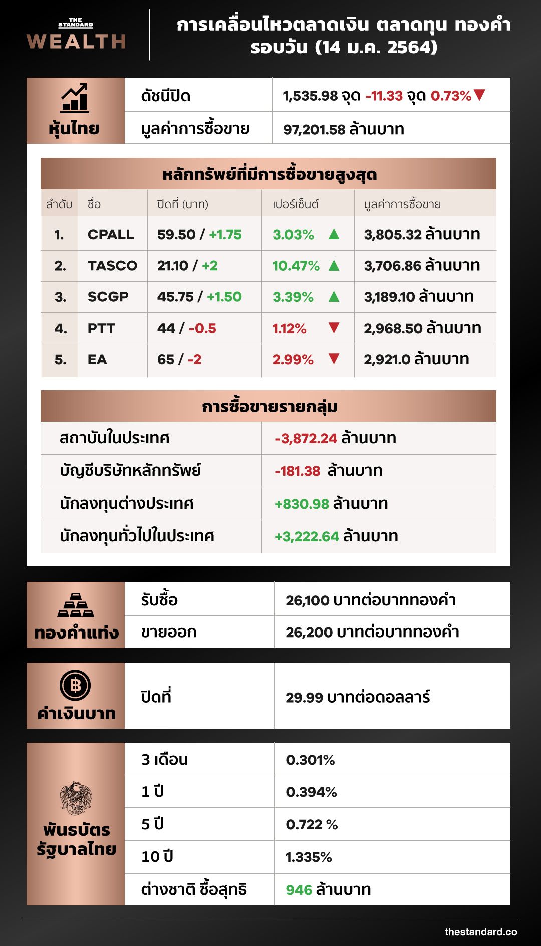 หุ้นไทยร่วง 11 จุด ปิดการซื้อขายที่ 1,535.98 จุด สถาบันในประเทศ-พร็อพเทรดเทขายหุ้นพลังงานหลังจากราคาปรับเพิ่มขึ้นค่อนข้างมาก ขณะที่สถาบันต่างประเทศและนักลงทุนทั่วไปในประเทศเข้าซื้อหุ้นค้าปลีก-แพ็กเกจจิ้ง ด้านราคาทองคำยังปรับลงต่อเนื่อง ส่วนค่าเงินบาทขยับแข็งค่า ปิดที่ 29.99 บาทต่อดอลลาร์สหรัฐ