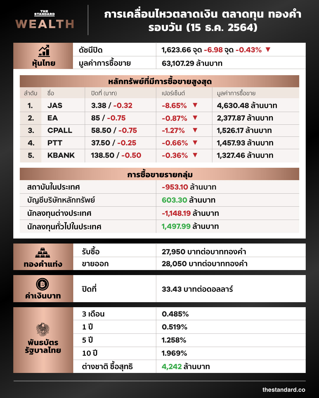 หุ้นไทยลบ 6.98 จุด ปิดการซื้อขายที่ 1,623 จุด ย่อตัวตามต่างประเทศ ตลาดยังเกาะติดสถานการณ์โควิดและผลประชุม Fed โดยนักลงทุนต่างประเทศขายสุทธิ 1.1 พันล้านบาท ขณะที่สถาบันในประเทศขายสุทธิ 953 ล้านบาท ราคาทองคำในประเทศย่อตัวต่อเนื่อง ขายออกอยู่ที่ 28,050 บาทต่อบาททองคำ เงินบาทแกว่งตัวในกรอบจำกัด ปิดที่ 33.43 บาทต่อดอลลาร์