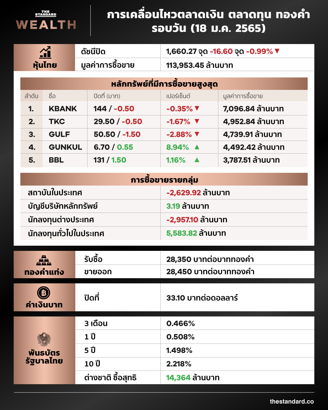 หุ้นไทยร่วง 16 จุด ปิดที่ 1,660 จุด นักลงทุนกังวลปัจจัยเสี่ยงจากต่างประเทศเพิ่ม หลังบอนด์ยีลด์สหรัฐฯ ปรับเพิ่มขึ้นต่อเนื่อง โดยสถาบันในประเทศและนักลงทุนต่างประเทศ ขายสุทธิ 5.5 พันล้านบาท ราคาทองคำในประเทศย่อตัว ทองคำแท่งขายออกที่ 28,450 บาทต่อบาททองคำ ส่วนค่าเงินบาทเคลื่อนไหวทิศทางแข็งค่าขึ้นเมื่อเทียบกับปลายสัปดาห์ที่แล้ว ปิดที่ 33.10 บาทต่อดอลลาร์