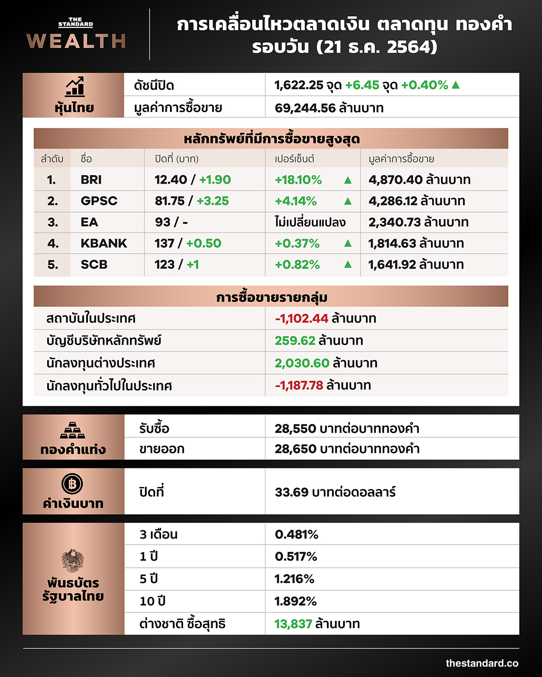 หุ้นไทยบวก 6.45 จุด ปิดการซื้อขายที่ 1,622 จุด ดัชนีรีบาวด์จากความคาดหวังเรื่องเศรษฐกิจไทยปีหน้าฟื้นตัวได้ตามแผน หลังกระทรวงการคลังผลักดันมาตรการกระตุ้น โดยนักลงทุนต่างประเทศเข้าซื้อสุทธิ 2 พันล้านบาท ราคาทองคำในประเทศขยับขึ้นเล็กน้อย ขายออกอยู่ที่ 28,650 บาทต่อบาททองคำ ค่าเงินบาทเคลื่อนไหวทิศทางอ่อนค่าในกรอบจำกัด ปิดที่ 33.69 บาทต่อดอลลาร์