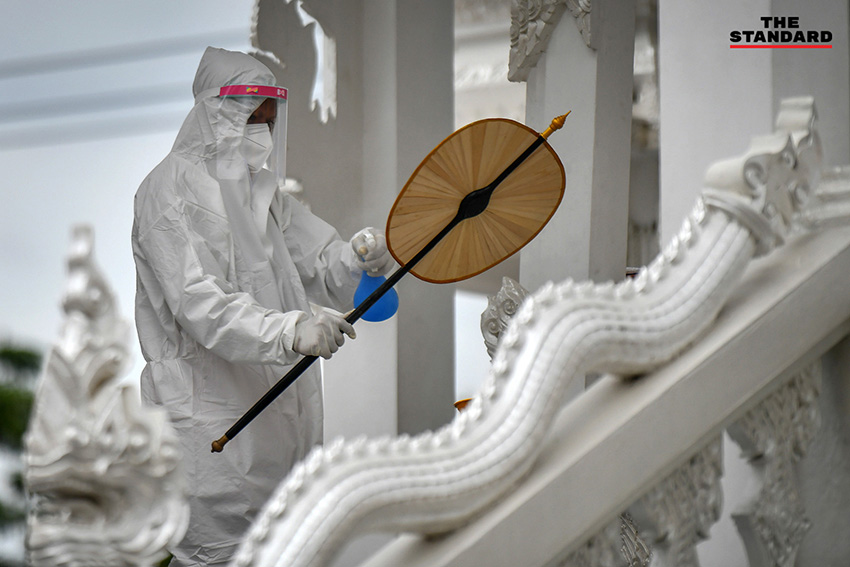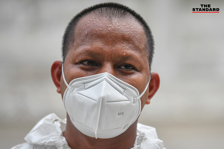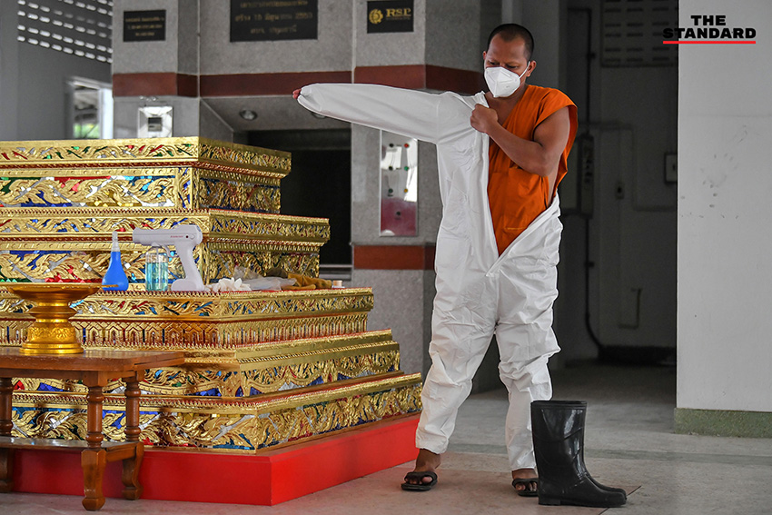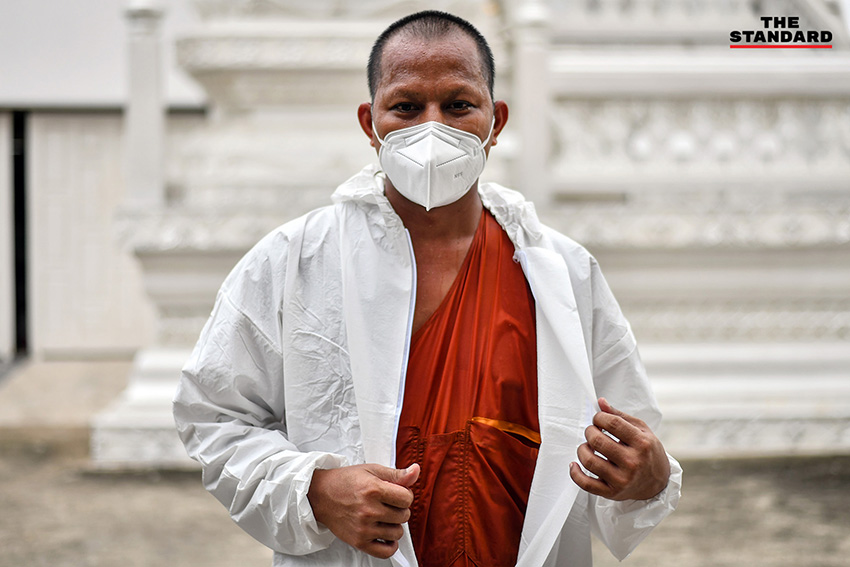 นี่คือภาพของ ‘พระพงษ์เพชร สันติกาโร’ กำลังสวมใส่ชุด PPE สีขาว ซึ่งถูกสวมทับอยู่ภายใต้จีวรสงฆ์เพื่อทำหน้าที่เป็นสัปเหร่อ ช่วยเจ้าหน้าที่แบกโลงศพผู้เสียชีวิตจากโควิดขึ้นฌาปนกิจบนเมรุ วัดชินวรารามวรวิหาร ตำบลบางขะแยง อำเภอเมืองปทุมธานี จังหวัดปทุมธานี