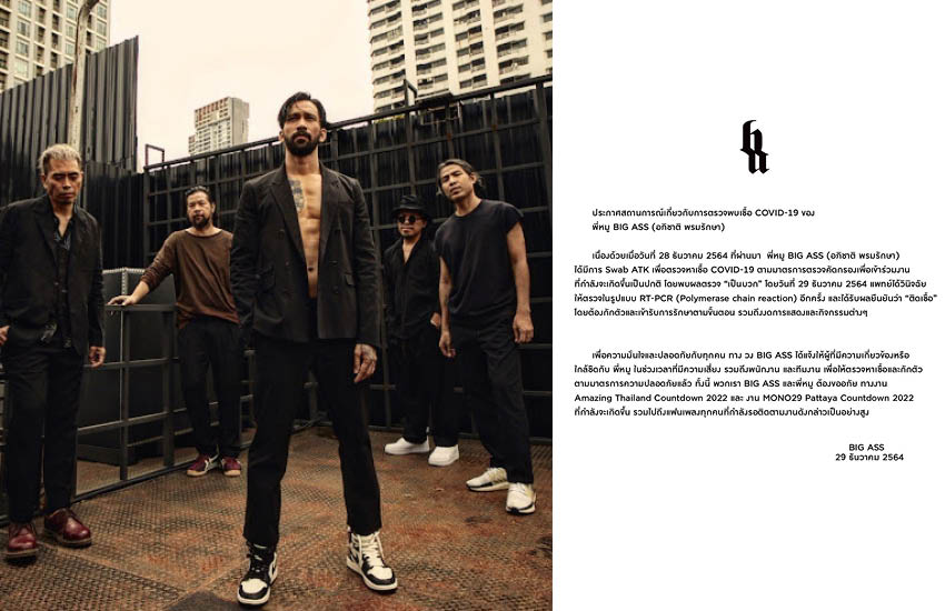 “เนื่องด้วยเมื่อวันที่ 28 ธันวาคม 2564 ที่ผ่านมา พี่หมู Big Ass (อภิชาติ พรมรักษา) ได้มีการ Swab ATK เพื่อตรวจหาเชื้อโควิด ตามมาตรการตรวจคัดกรองเพื่อเข้าร่วมงานที่กำลังจะเกิดขึ้นเป็นปกติ โดยพบผลตรวจ ‘เป็นบวก’ โดยวันที่ 29 ธันวาคม 2564 แพทย์ได้วินิจฉัยให้ตรวจในรูปแบบ RT-PCR (Polymerase Chain Reaction) อีกครั้ง และได้รับผลยืนยันว่า ‘ติดเชื้อ’ โดยต้องกักตัวและเข้ารับการรักษาตามขั้นตอน รวมถึงงดการแสดงและกิจกรรมต่างๆ