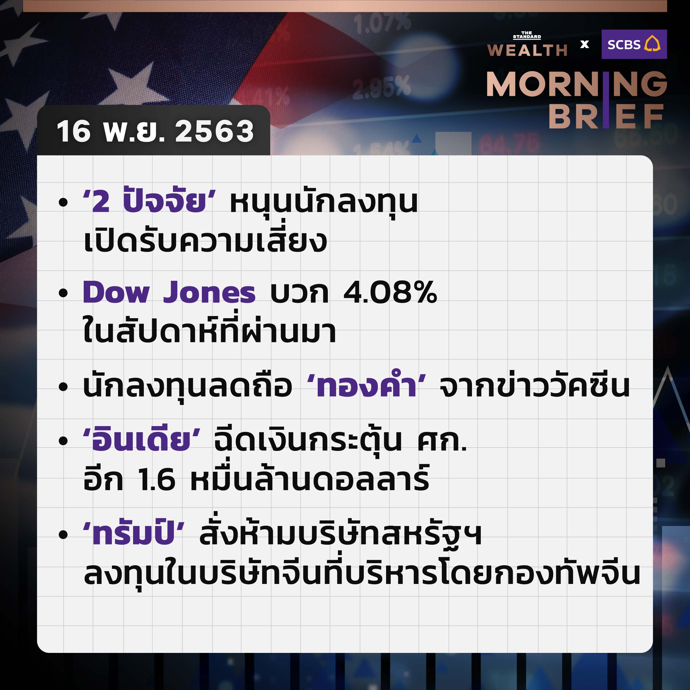 ต้อนรับเช้าวันใหม่กับความเคลื่อนไหวสำคัญในโลกเศรษฐกิจ การเงิน และการลงทุน ประจำวันที่ 16 พฤศจิกายนใน THE STANDARD WEALTH Morning Brief