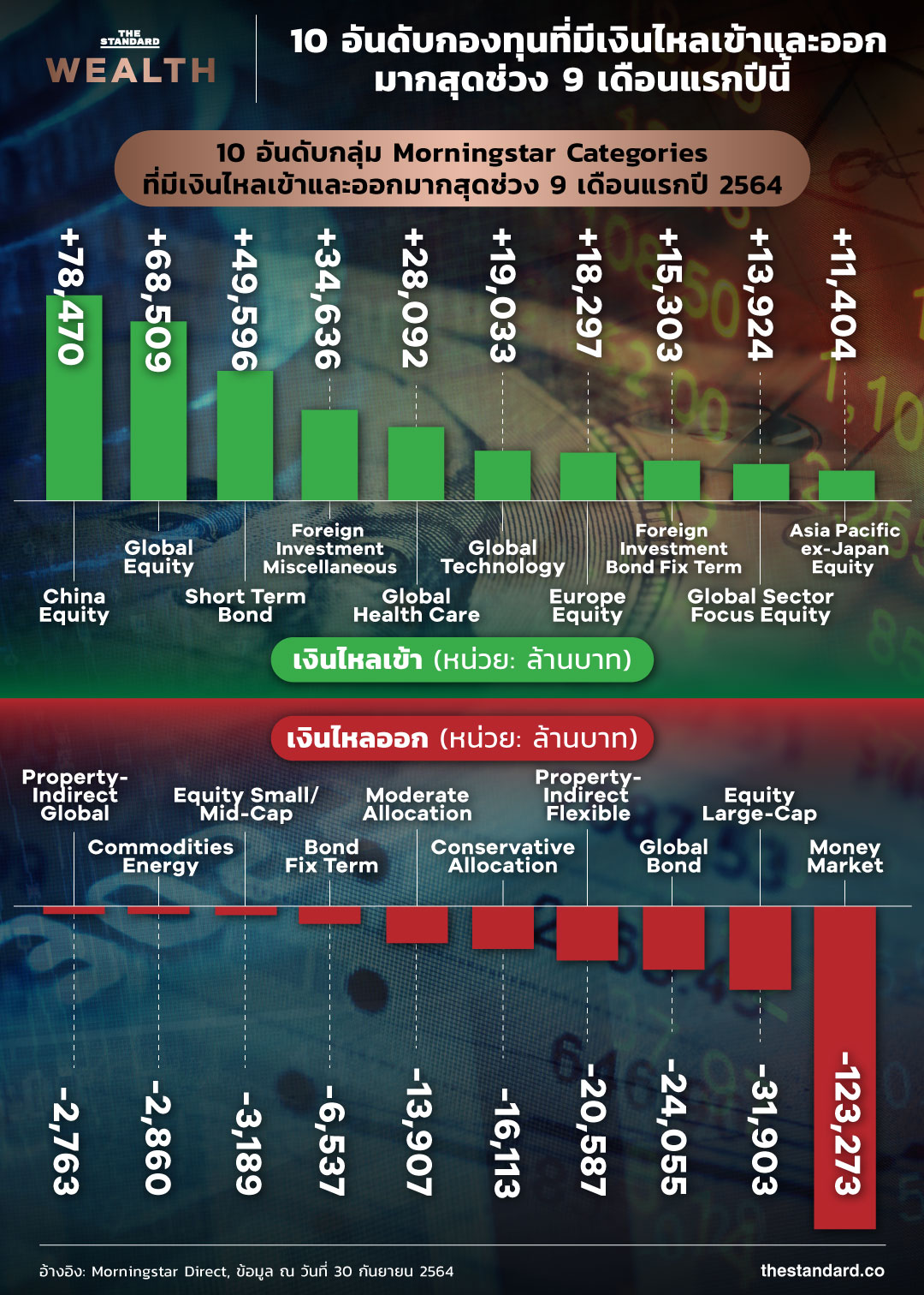 • ช่วง 9 เดือนแรกปี 2564 พบเงินไหลเข้ากองทุนรวมไทยกว่า 1.3 แสนล้านบาท โดยไหลเข้ากองทุนหุ้นจีนมากสุด